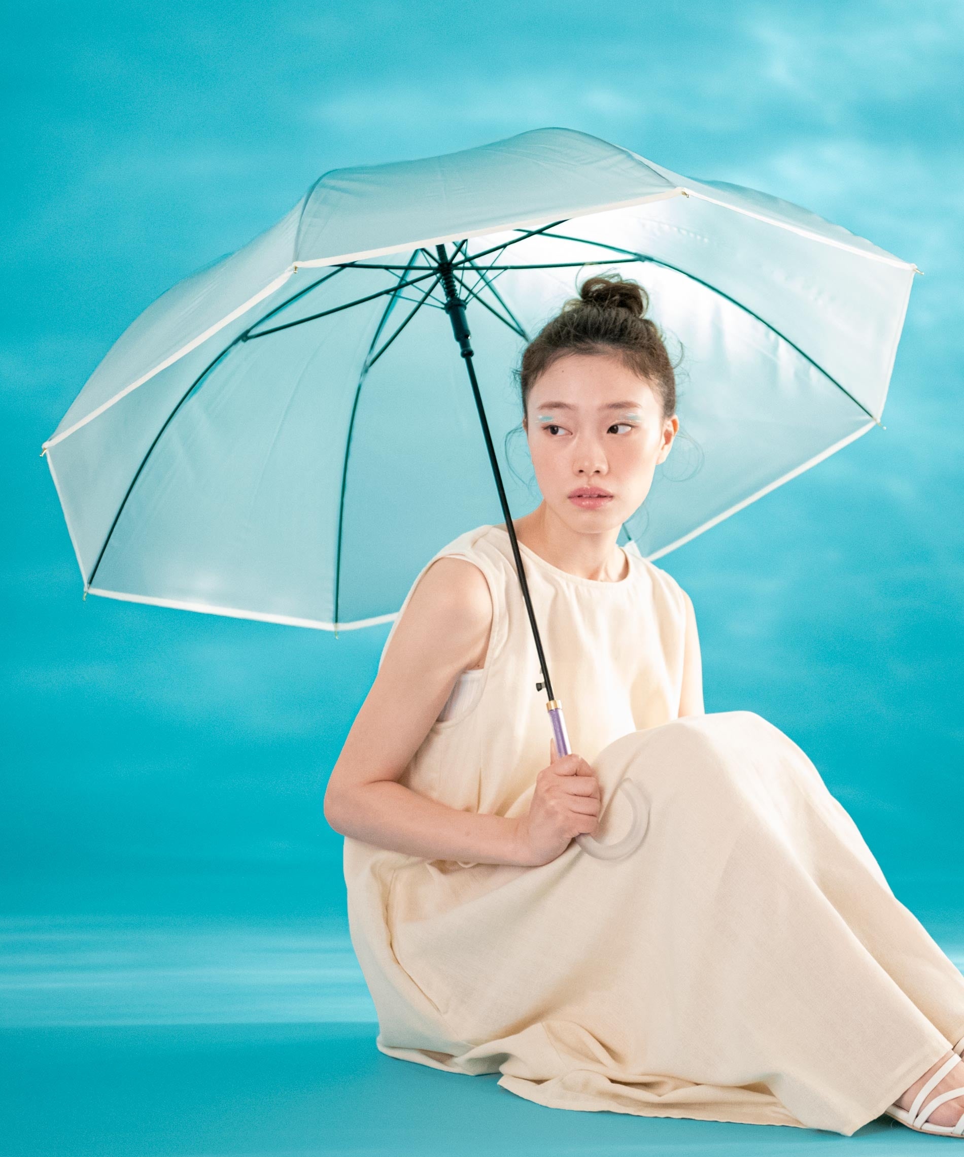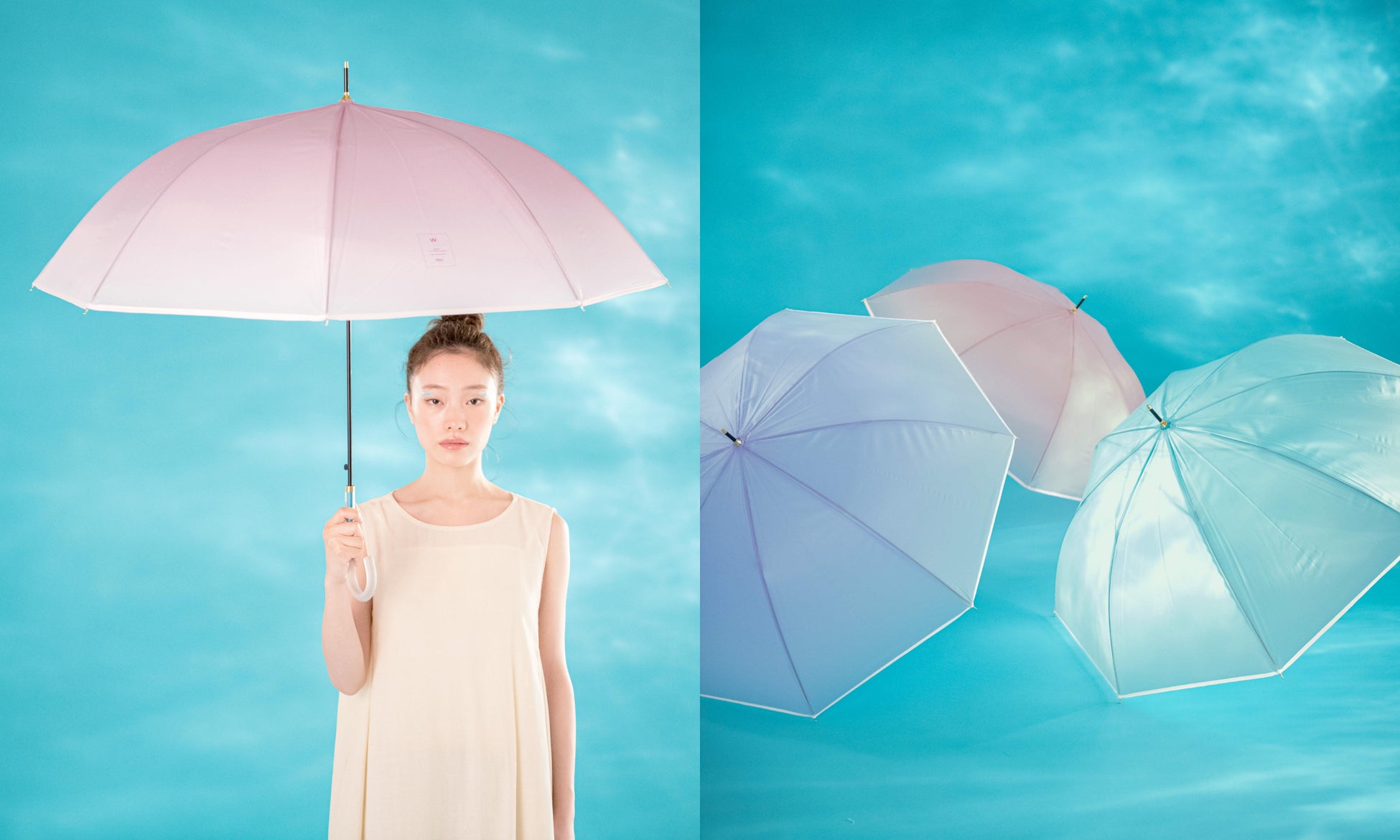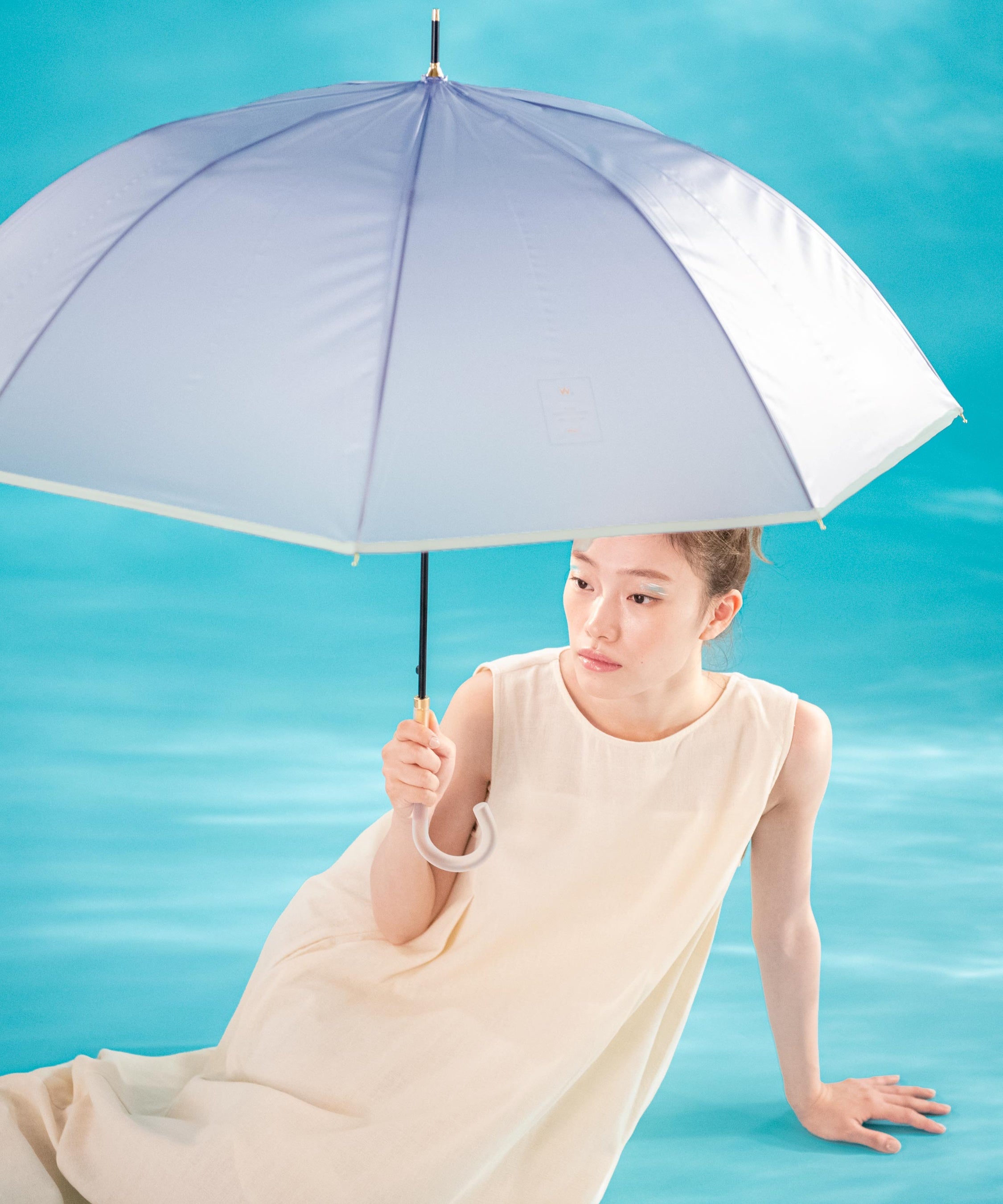 とろんとした半透明の生地を使用し、長傘と折りたたみ傘で揃えた「コスメティックアンブレラ」。
