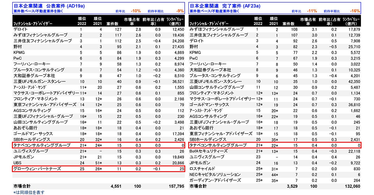 株式会社タナベコンサルティンググループ(本社:東京都千代田区・大阪市淀川区、代表取締役社長:若松 孝彦)とグローウィン・パートナーズ株式会社(東京都千代田区永田町、代表取締役CEO:佐野 哲哉)は、ロンドン証券取引所グループ傘下のRefinitiv(リフィニティブ)発表の「日本M&Aレビュー2022年」(2022年1月1日から2022年12月31日の期間に公表された案件が対象)にランクインいたしました。