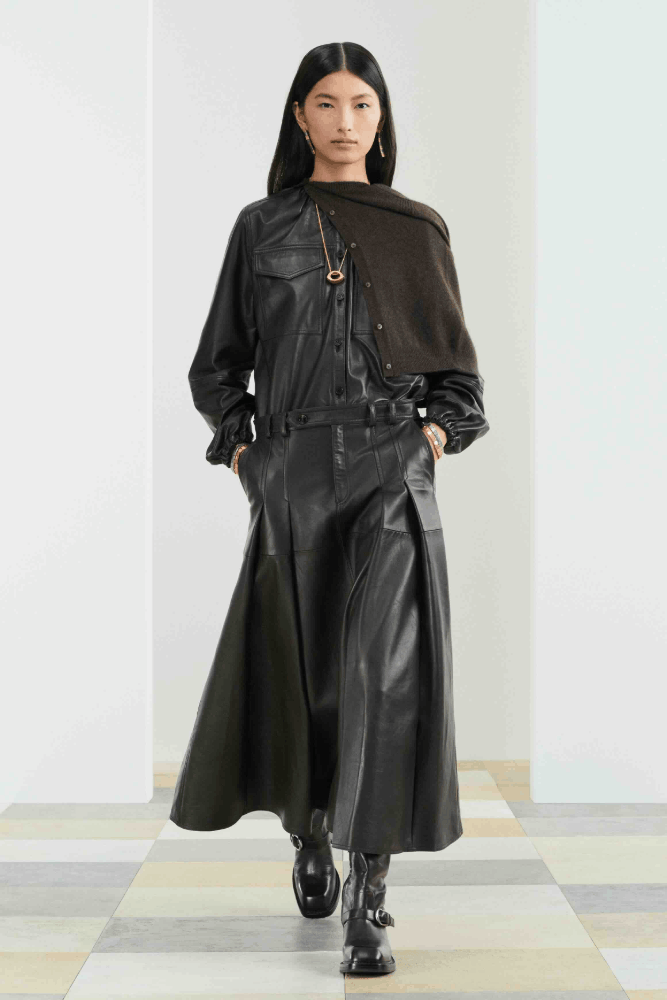 AW25のウィメンズコレクションは、最大限の汎用性と、煩わしさのない着心地を追求して構築されています。フィールドコートやトレンチの系譜を受け継ぐアウターは、アームやチェストにゆとりを持たせたカッティングで、軽やかな動きを実現。コンパクトなニットやハリのあるポプリンが、シルエットを鮮明に引き締めます。スカートやトラウザーは、ブーツに自然に沿い、しなやかに動くよう計算されています。動きやすさを備えつつ、ファッションの表現は明快で日中の装いに最適です。しかしながら、複数のルックはそのまま夜の装いへも自然に移行します。細身のスカートに長く美しい落ち感のコートを合わせるスタイルや、光沢感と構造が存在感を際立たせるボンバージャケットのピースが印象を一段と引き上げます。ハードウェアはすべてに理由があります。一体型のベルトは装いを格上げし、裾のアジャスターはシルエットのボリュームを自在にコントロールします。その結果生まれるのは、複雑さのない洗練されたスタイルです。