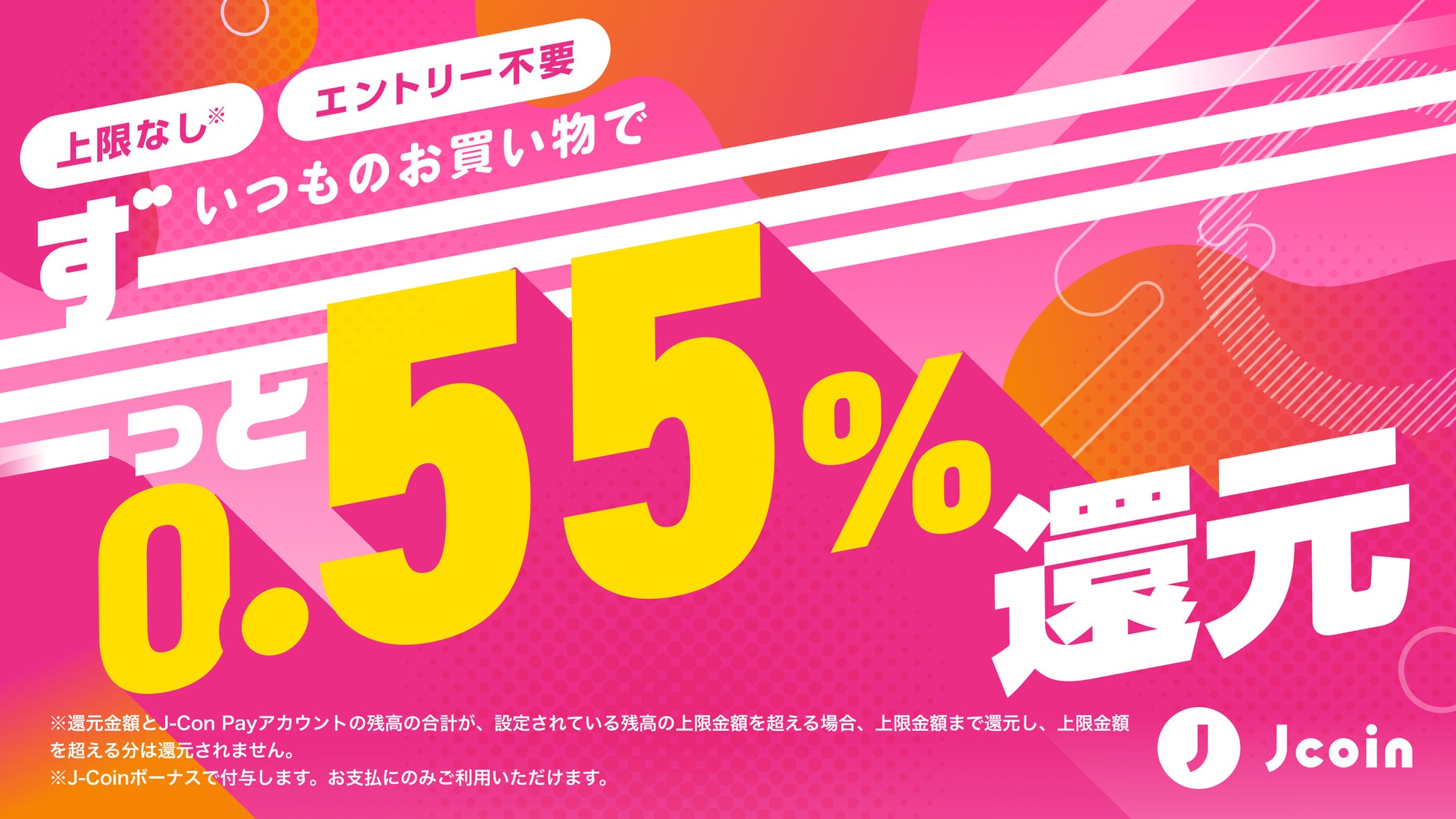 J-Coin Pay「ずーっと0.55%還元キャンペーン」を実施!決済金額の0.55%をボーナス還元!(上限なし)