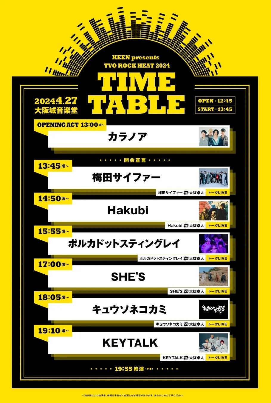 カラノア/梅田サイファー/Hakubi/ポルカドットスティングレイ/SHE'S/キュウソネコカミ/KEYTALK