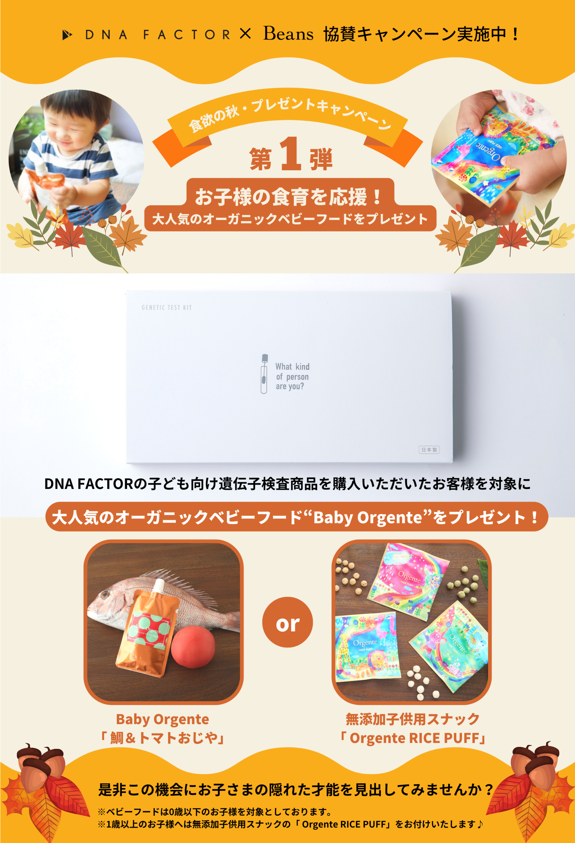 DNA FACTORの子ども向け遺伝子検査商品をご購入いただいたお客様を対象に、大人気ベビーフード“Baby Orgente 鯛&トマトおじや”or“無添加子供用スナックの「 Orgente RICE PUFF」” をプレゼントいたします♪