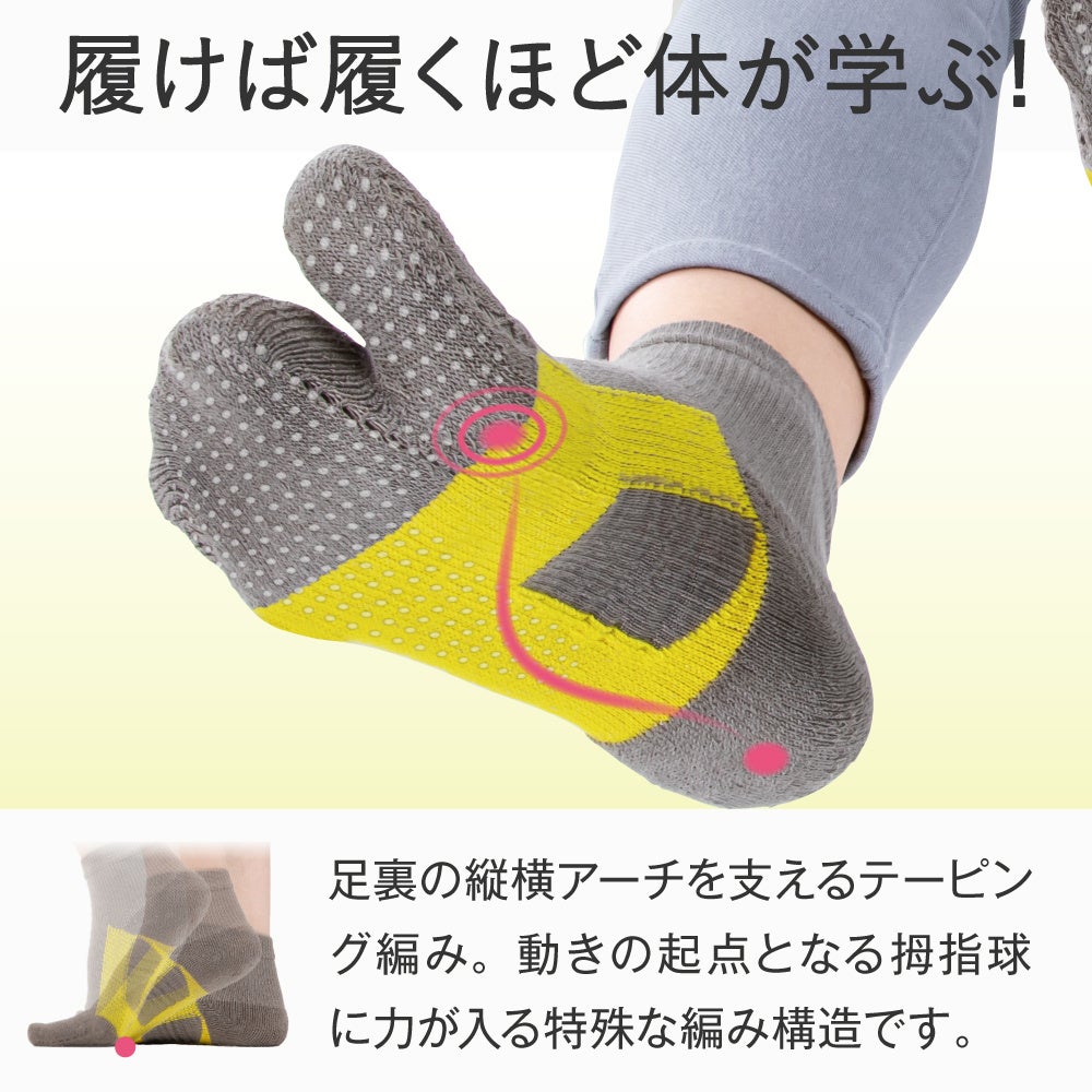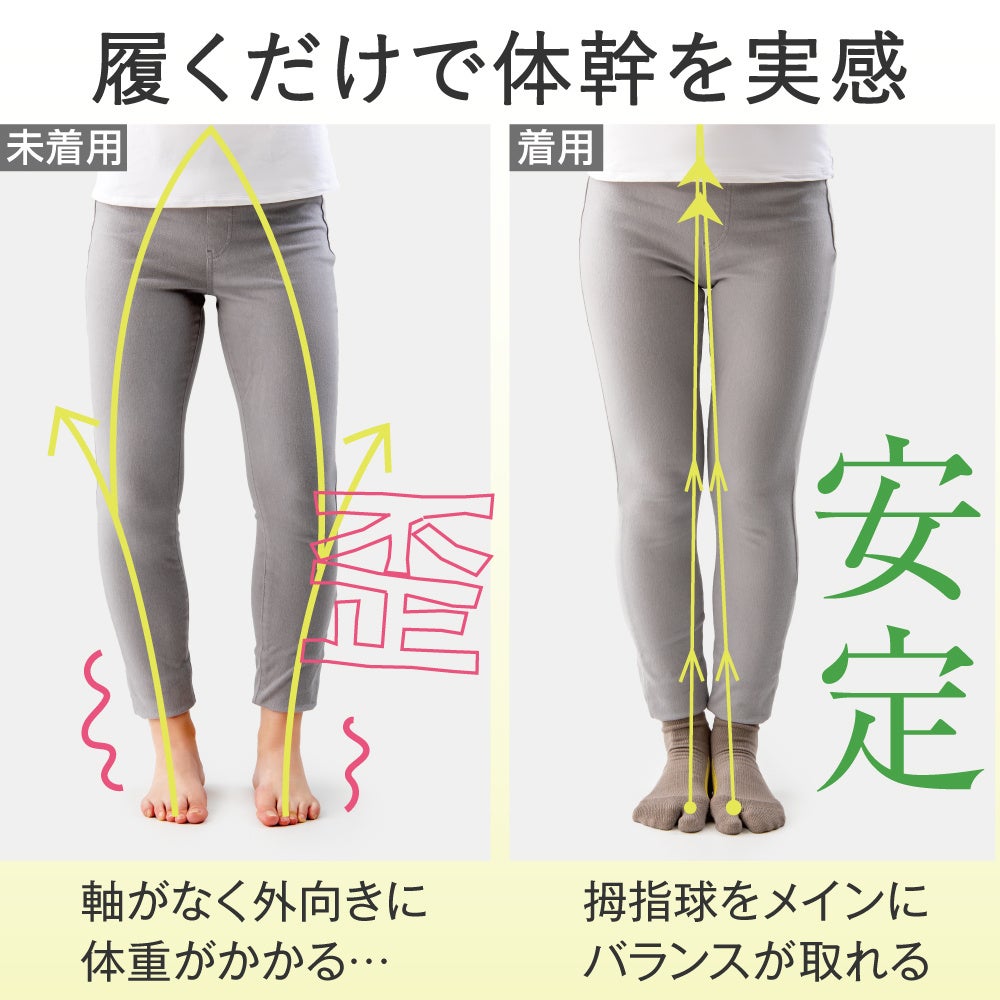 動きの起点「拇指球」に力が入る特殊な編み構造で、履くだけで体の中心・体幹を意識しバランスが安定するソックスタイプのサポーターです。