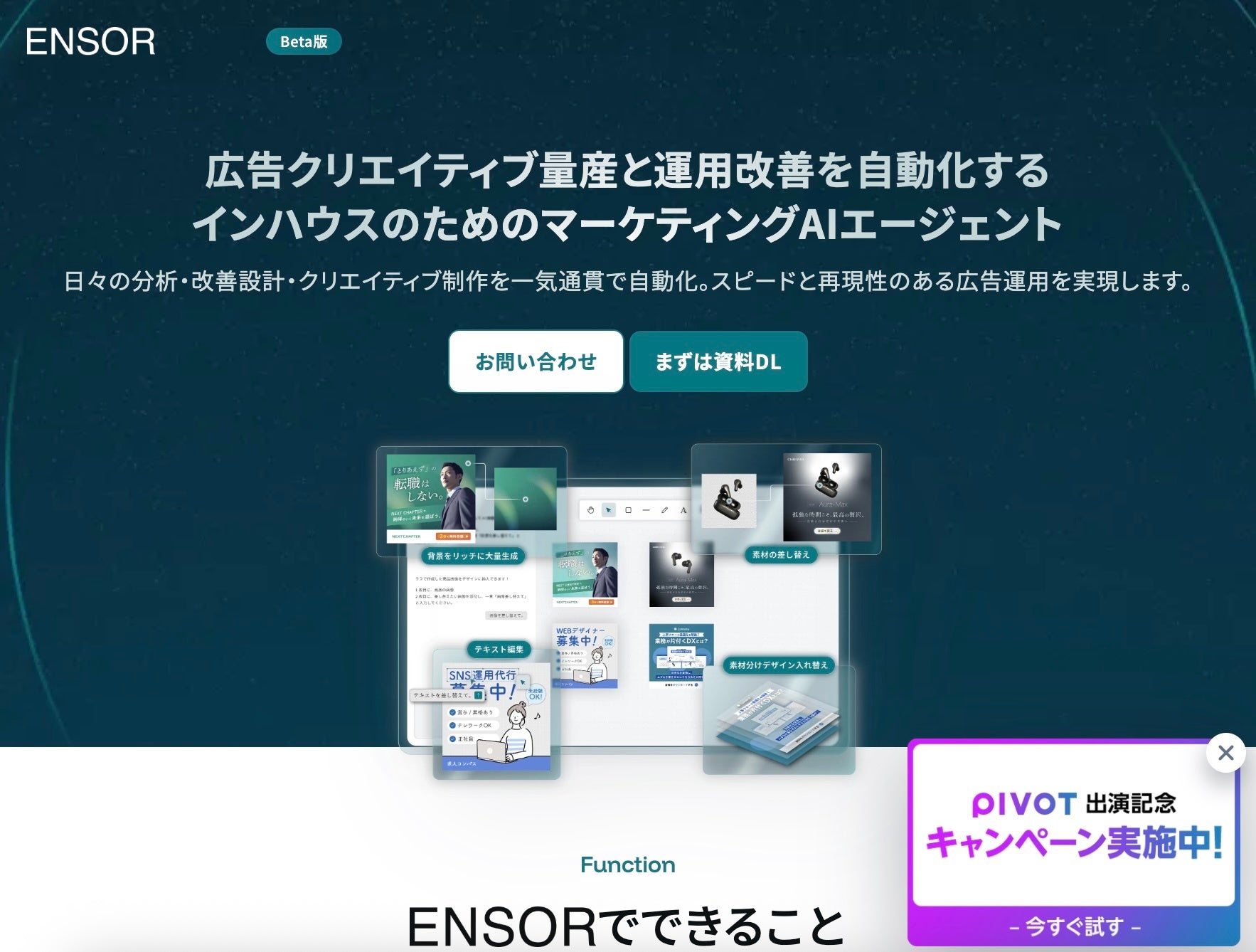 ENSORは、「勝ちバナーを量産するAI──学び続けるマーケティングOS」をコンセプトとした、マーケター向けAIクリエイティブ生成プラットフォームです。クリエイティブの施策立案から連携・生成までを、従来の1/5の時間で実行します。広告・CRM・SFA・ECなどに散在するデータを統合し、AIがリアルタイムで分析・施策提案を実行するマーケティングAI OSとして、データ分析・クリエイティブ生成業務の工数削減を実現しています。