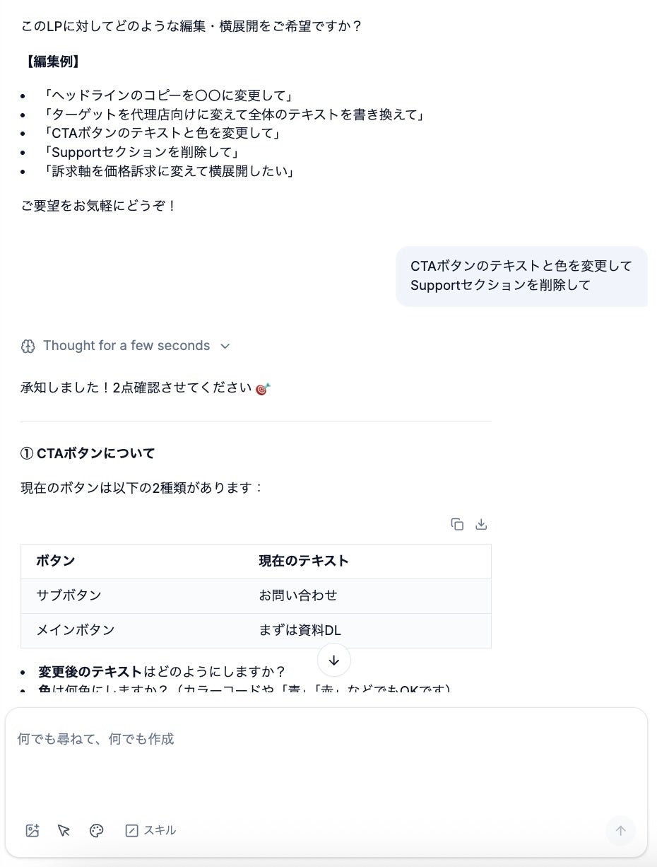 〜 チャットにURLを入力するだけでレイアウトを完全再現し、要素を瞬時に修正。LP公開機能ではワークスペース単位のサブドメインとページパスを設定し、公開ステータスと公開バージョンを管理 〜