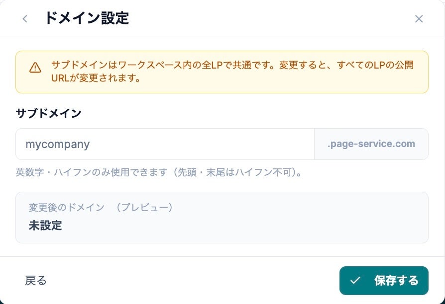 ページ作成時に公開オプションが利用でき、固定ドメイン部分として page-service.com を用いたURL設計が可能です。ワークスペース共通のサブドメインと、ページ固有のパスを組み合わせて公開URLを構成できます。公開ステータスに加え、**公開バージョン**を選択できる仕様とし、編集内容を本番の公開に反映するには*公開バージョンの更新*が必要となる運用で、下書きと外向きの版の整理をしやすくします。