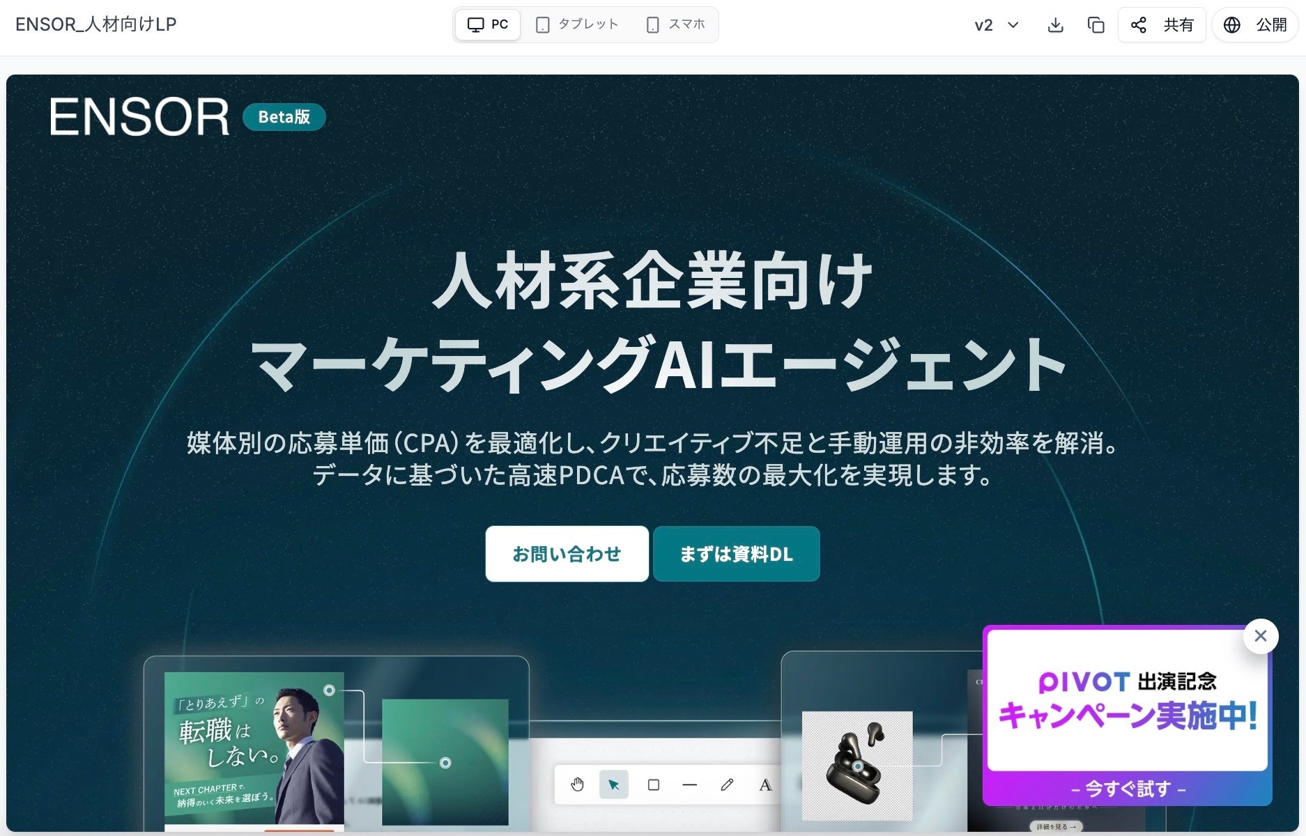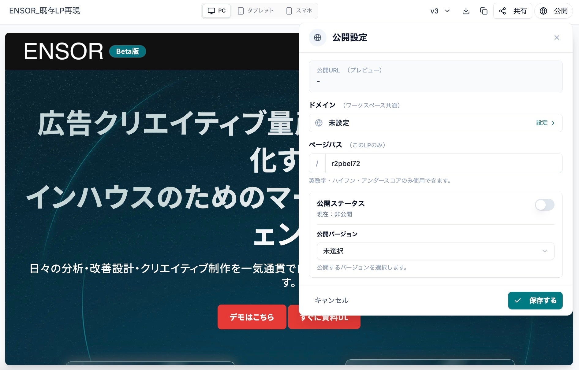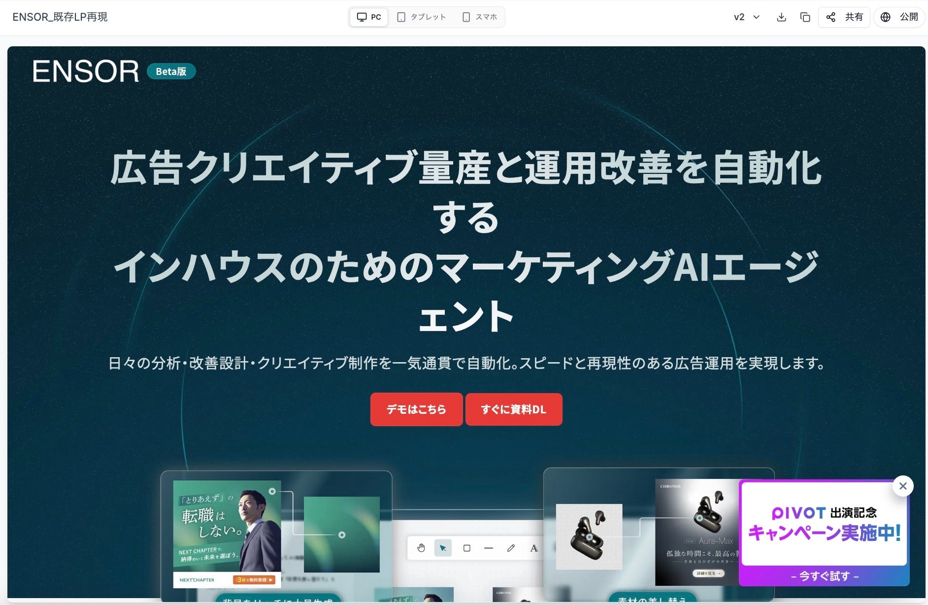 マーケティングAI OS「ENSOR」、LPの完全再現とLPデプロイ(公開)機能を搭載 ── 既存LPを取り込み即編集、所定ドメインでバージョン管理付き公開が可能に