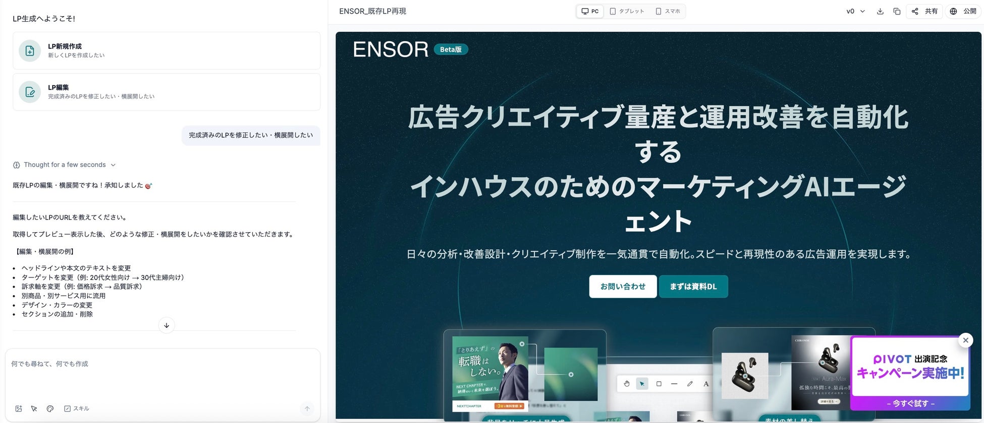 ENSORのLP制作チャットに、既存LPのURLを入力すると、ページ構成を取り込み、画面上でレイアウトを再現します。再現した状態から、ファーストビューの変更や要素の修正などを対話ベースで進められ、制作の立ち上がりを短縮します。
