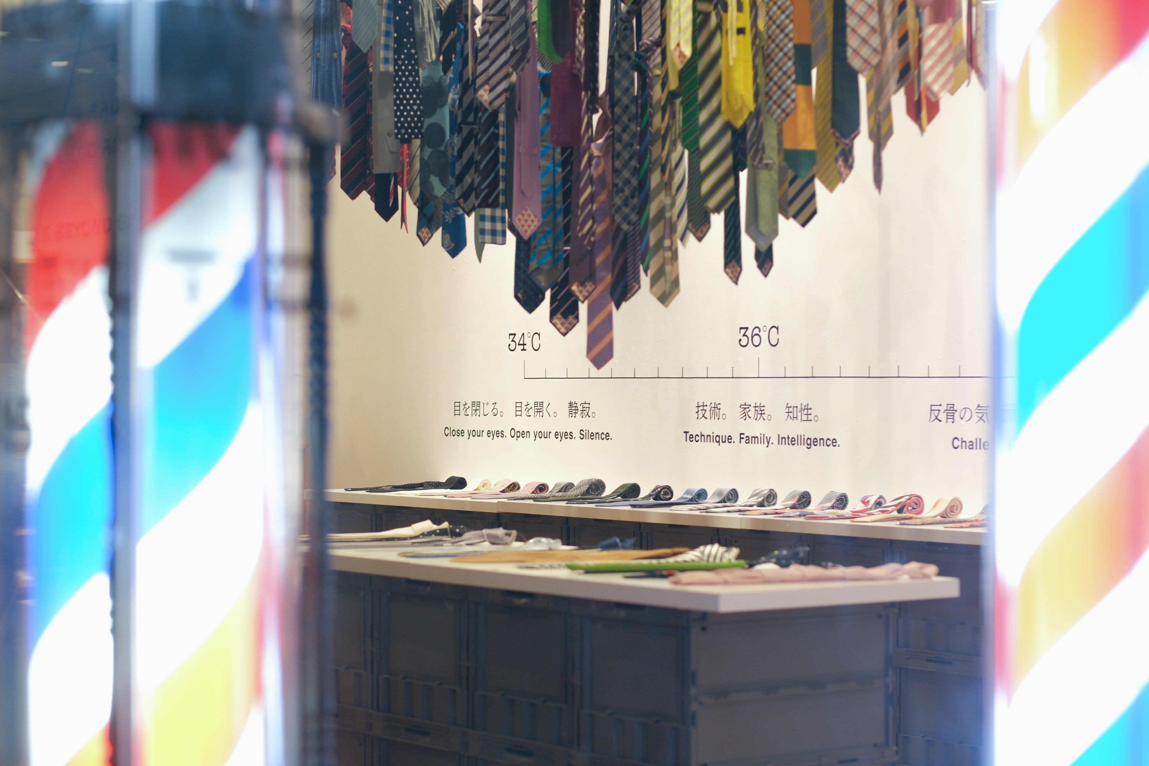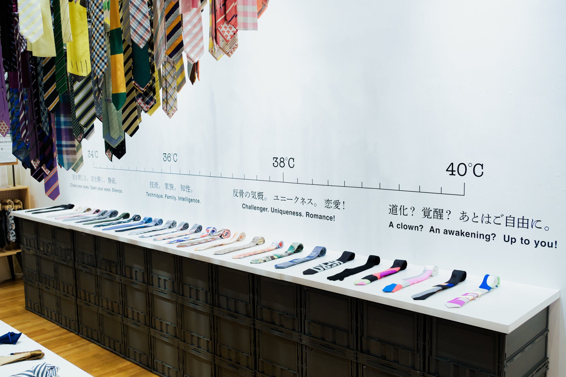 giraffeのネクタイは、34℃、36℃、38℃、40℃と4段階の体温に区分けされ、商品タグにその温度が記されています。体温が上がるほどにその高揚感は増していき、今日目指す温度・テンションを設定し、その温度のネクタイに自分を叱咤激励してもらうことをイメージしています。本展では、過去のアーカイブから、それぞれの体温を象徴するアイテムを展示しています。