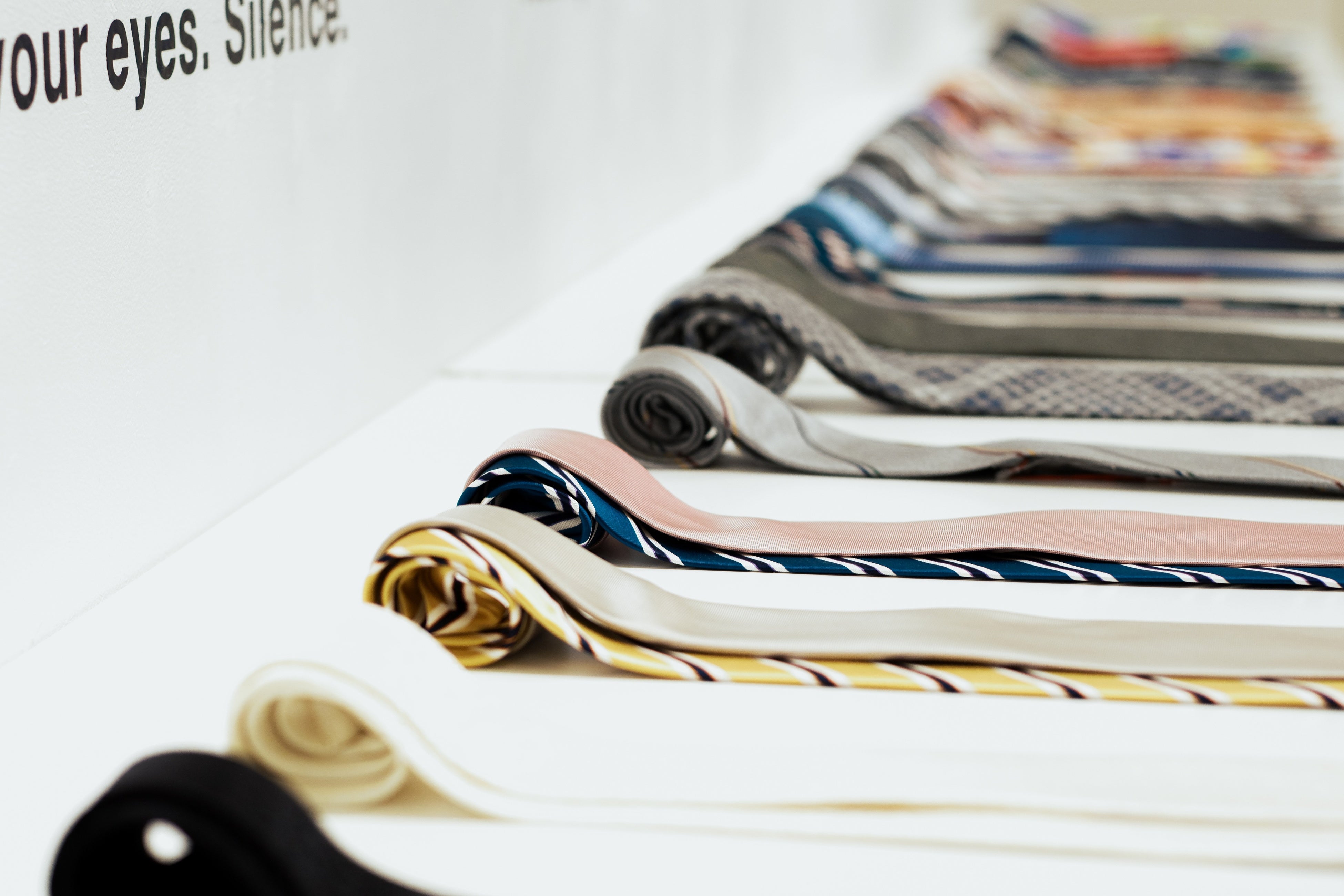 giraffe のアイコニックな展示スタイル(通称:ナイアガラ)で、時代は変われど冷めることのないネクタイ愛を表現しています。