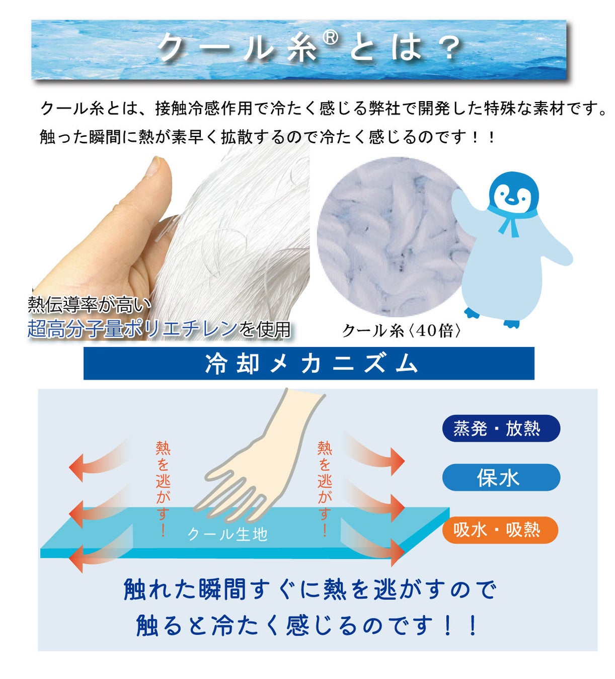 熱伝導率が高い超高分子量ポリエチレンを使用しており、それをタオル織機で織れるように独自で開発した成願オリジナルの特殊な糸です。