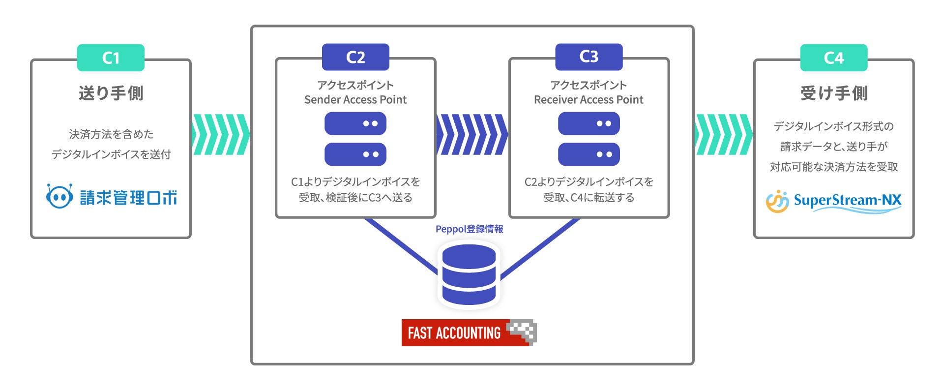 この度の疎通テストは、異なるシステム間でのデータ送受信も可能であることが特徴のデジタルインボイスにおいて、『請求管理ロボ』から出力されたデジタルインボイスデータを、ファーストアカウンティングが提供するPeppolアクセスポイントを介し、『SuperStream-NXデジタルインボイスオプション』にて受信する取り組みとなります(※)。