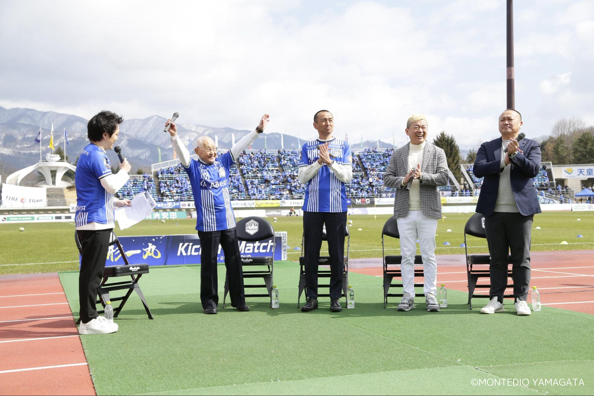 試合前には、世界最高齢アイアンマン・稲田弘氏をはじめ、SCOグループ代表取締役社長・玉井雄介、モンテディオ山形代表取締役社長・相田健太郎氏らが登壇し、「3つの数字」にまつわるトークショーを開催。