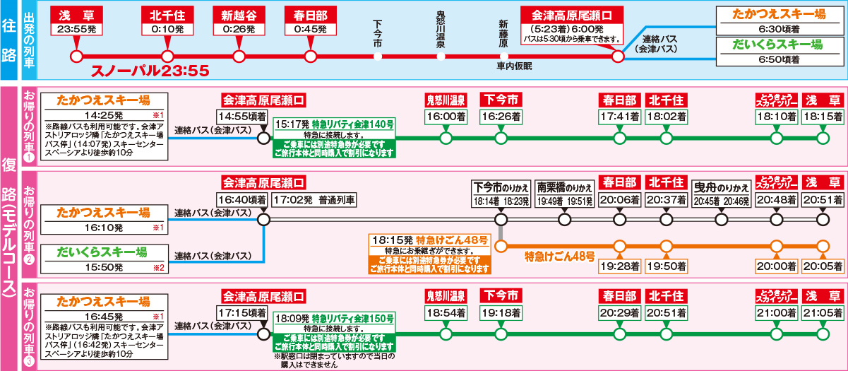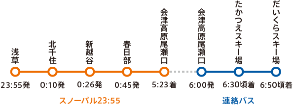 浅草23時55分発・北千住 0時10分発・新越谷 0時26分発・春日部 0時45分発・会津高原尾瀬口 5時23分着