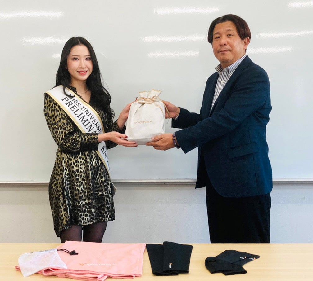 私自身、昨年「ミス・ユニバース・ジャパン」を経験し、神奈川大会の時と比べて、やはり厳しい世界だなということを実感しました。 私は、身長が小さめということがコンプレックスだったので、トレーニング期間中もそうですし、集合時間の際も16センチというヒールを履くことが欠かせませんでした。本番が近くなってくると「集中トレーニング」と呼ばれるトレーニングが、1・2週間ほど毎日続きます。その中で足に気を遣ってマッサージをしていても、なかなか疲れが取れなかったり、だんだん感覚がなくなったりしていました。そこで今回、このような優れた商品を提供していただけることが光栄ですし、本当に貴重です。ありがとうございます。