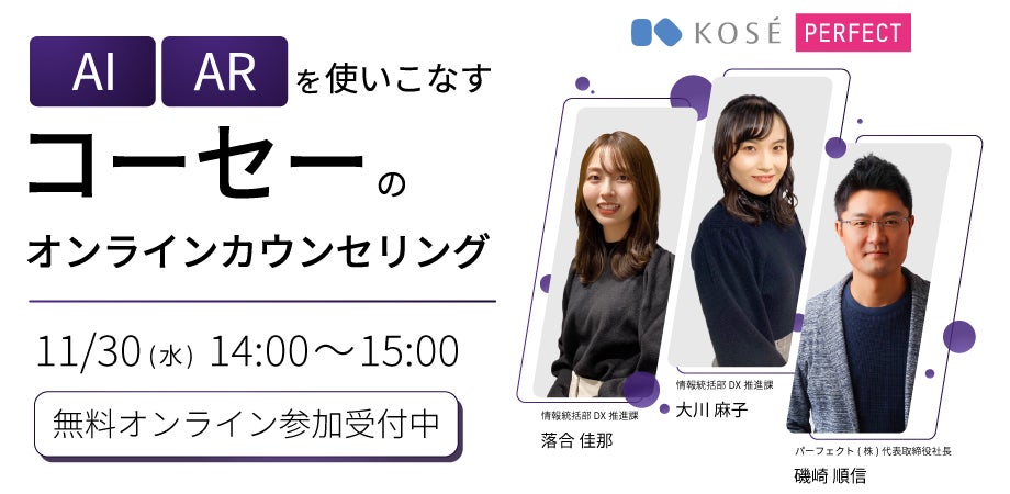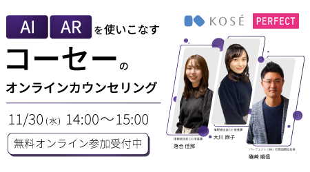 日本・東京(2022年11月15日)- ARおよびAI技術を活用したソリューションサービスを提供し、美容業界とファッション業界でデジタルトランスフォーメーション(DX)を奨励するパーフェクト株式会社は、11月30日(水)14時より、「AI・ARを使いこなすコーセーのオンラインカウンセリング」をテーマに、株式会社コーセーより情報統括部 DX推進課にて、最新のテクノロジーを活用したシステムの検討から運用を行っている大川氏、落合氏を招待し、無料オンラインビジネスセミナーを開催致します。
