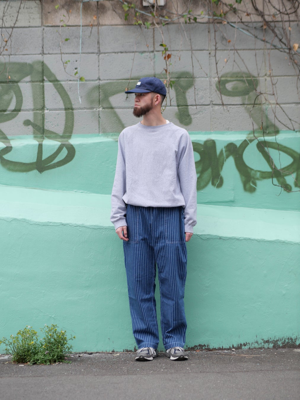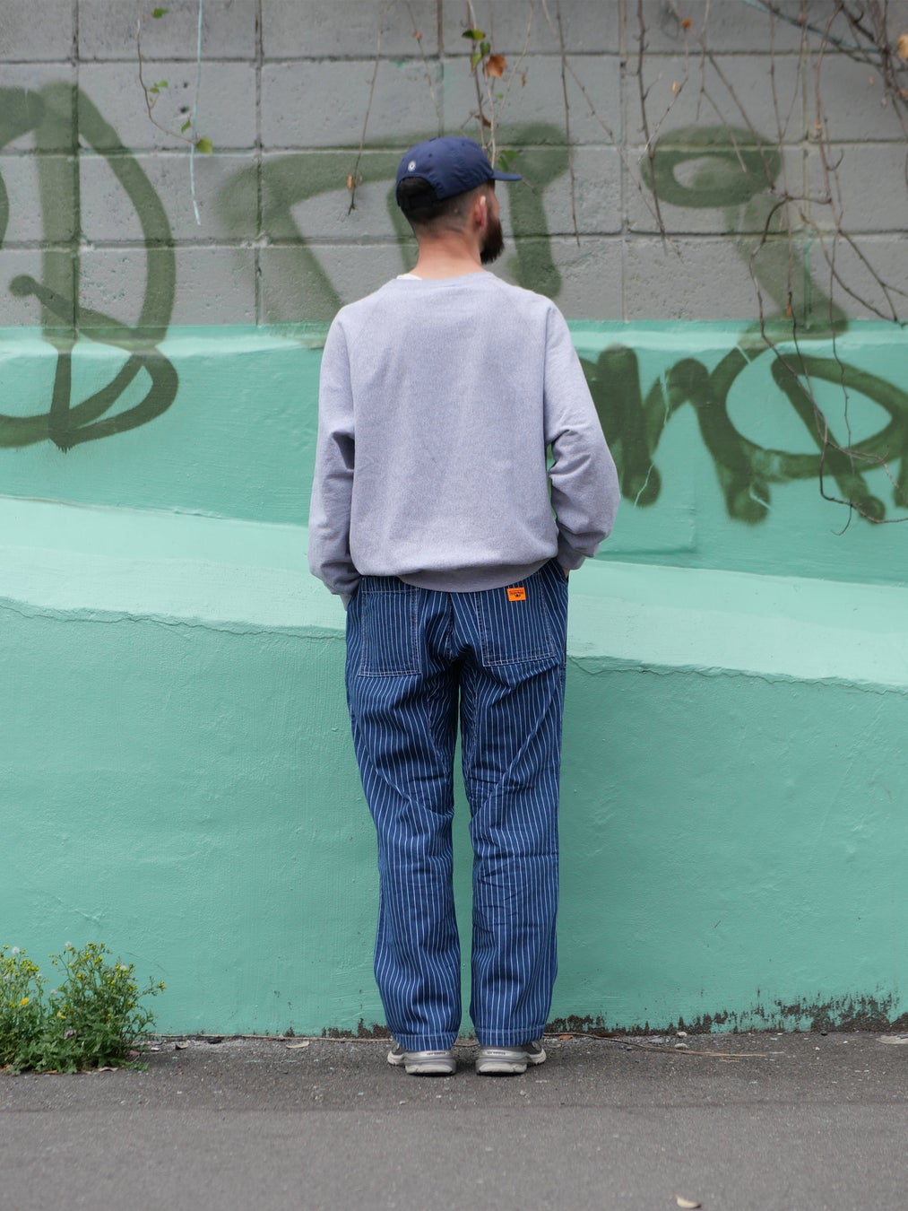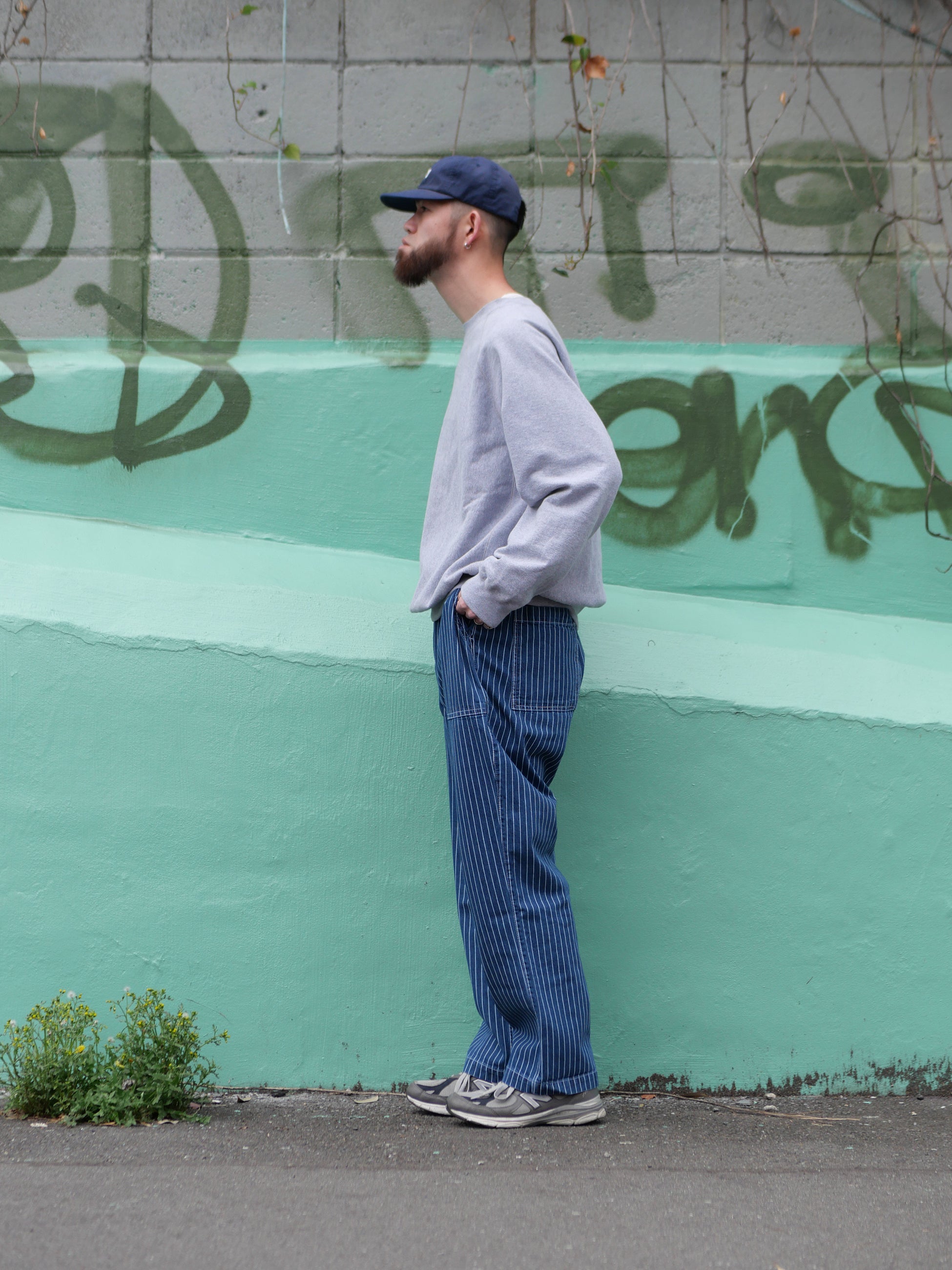 今シーズンの新作モデルです。デニム素材にピンストライプを組み合わせた一本。ライトオンスの生地を採用し、軽やかな穿き心地に仕上げています。ジャストからルーズまで、幅広いスタイリングに対応します。