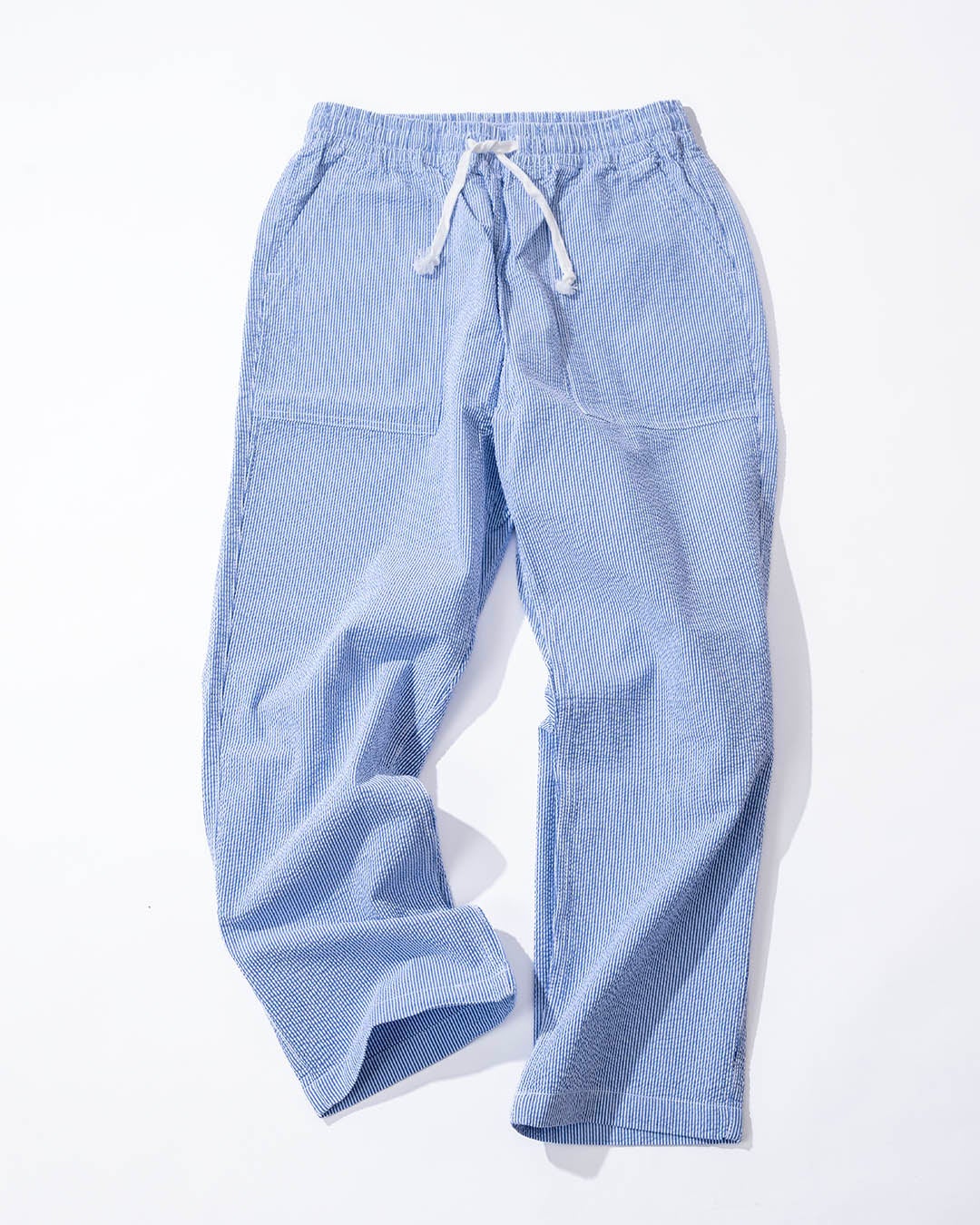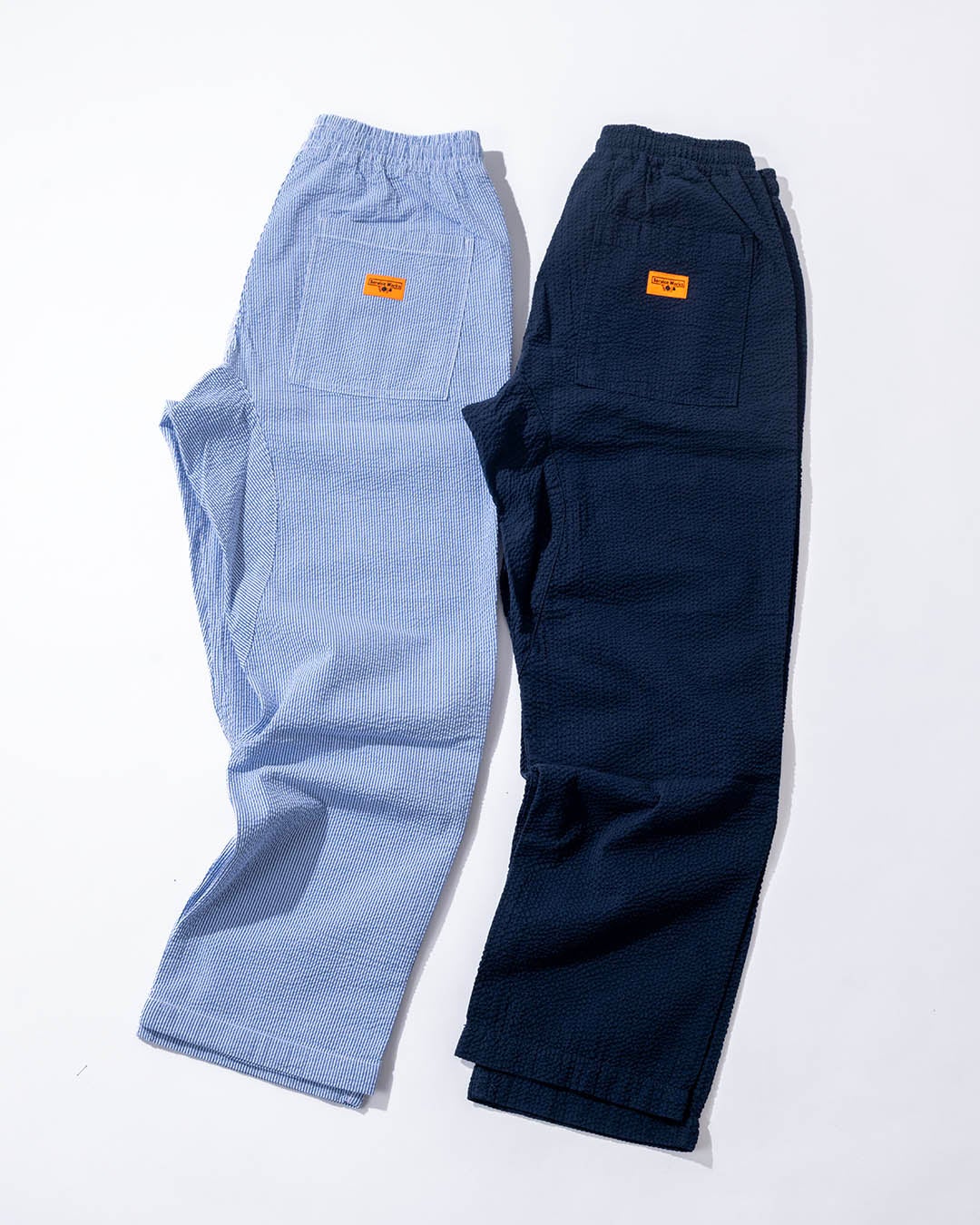 定番のシェフパンツに、春夏シーズン向けのシアサッカー生地を採用したモデルです。表面に凹凸のあるシアサッカーは肌離れがよく、快適な穿き心地を実現します。見た目の清涼感に加え、実用面でも軽やかさが際立ちます。夏に向けたワードローブに適した一本です。