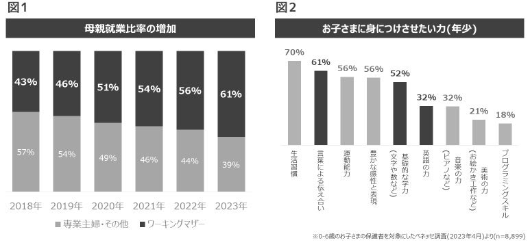 直近の幼児と保護者を取り巻く環境変化として、共働き世帯は増加し、「忙しく子と十分に関わり切れない」という課題を抱えている保護者が増えています。なかでもワーキングマザーは、5年前と比較して18%も増加傾向が続いています(図1)。
