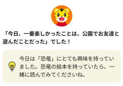 しまじろうとの「おしゃべり」や「あそび」の中で見えた「興味」や「感情」をAIが分析し、専用サイトでレポートを表示します。お子さまの成長が見えることに加え、気づかなかった興味や好きを発見し、伸ばしてあげることをサポートできます。