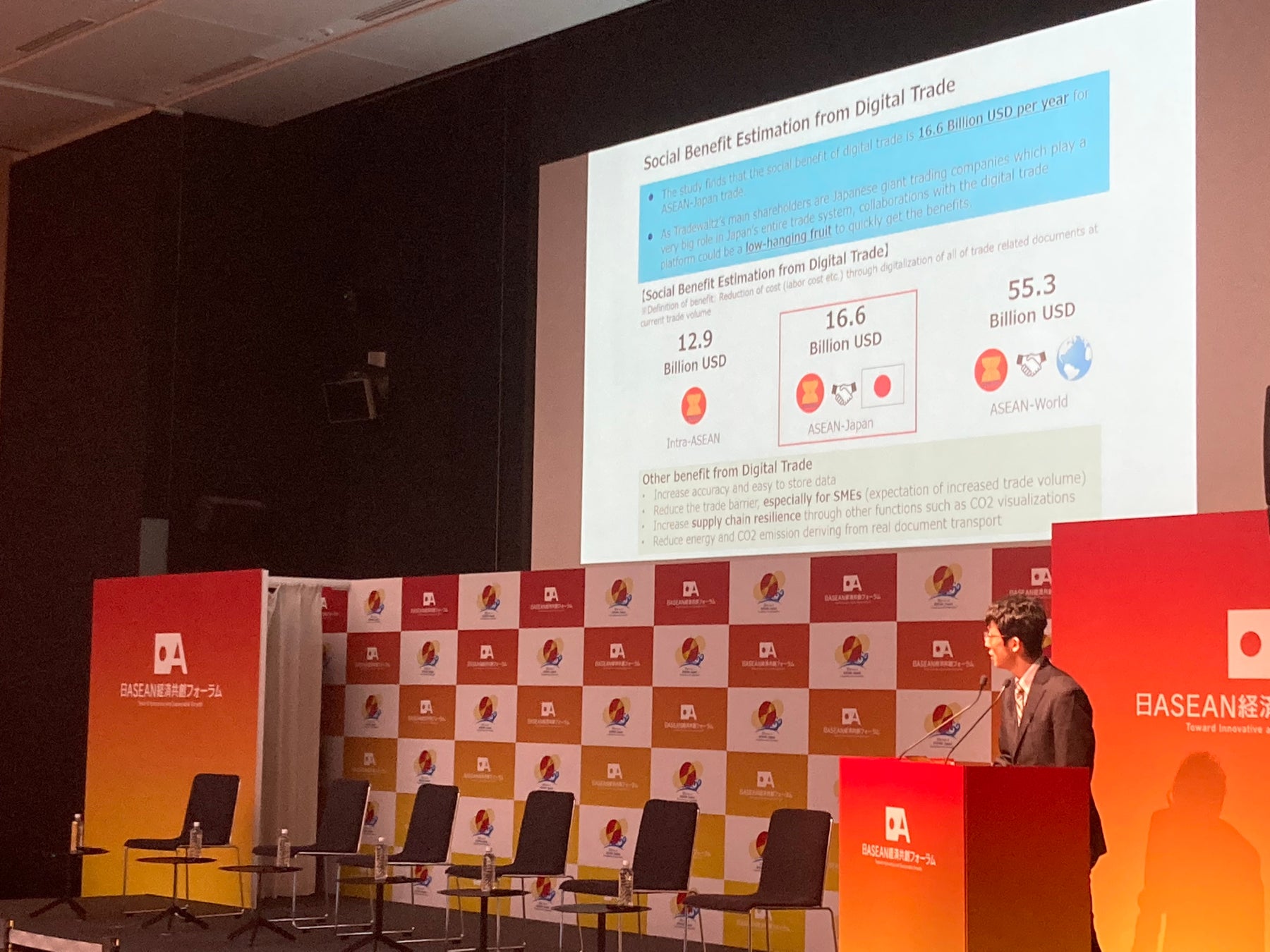 今回のプレスリリースで発表する新しい情報はここからです。12月、日ASEAN特別首脳会議での共同声明発表が近づく中、供給網・デジタルが経済共創の注力分野の軸の一つとなり、( https://www.nikkei.com/article/DGXZQOGM065B40W3A201C2000000/ )首脳会議前日16日開催の日ASEAN経済共創フォーラムでも午前中いっぱいの時間をつかって、貿易デジタル化のディスカッションをすることとなりました。トレードワルツも登壇者としてASEAN各国の代表者と議論を交わすこととなりました。
