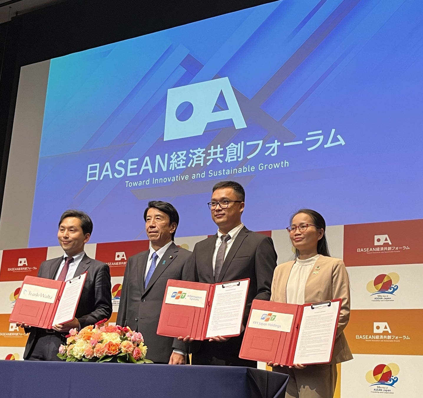 貿易情報連携プラットフォーム「TradeWaltz®︎」を運営する株式会社トレードワルツ(以下:トレードワルツ)は、2023年12月16日、六本木ヒルズで開催された日ASEAN経済共創フォーラムに登壇し、パネルディスカッションにおいてタイ・シンガポール・インドネシア・ベトナムでの取組状況を紹介したほか、ベトナム大手IT企業FPT Information Systems Corporation社(以下「FPT社」)との協業MoUを紹介しました。