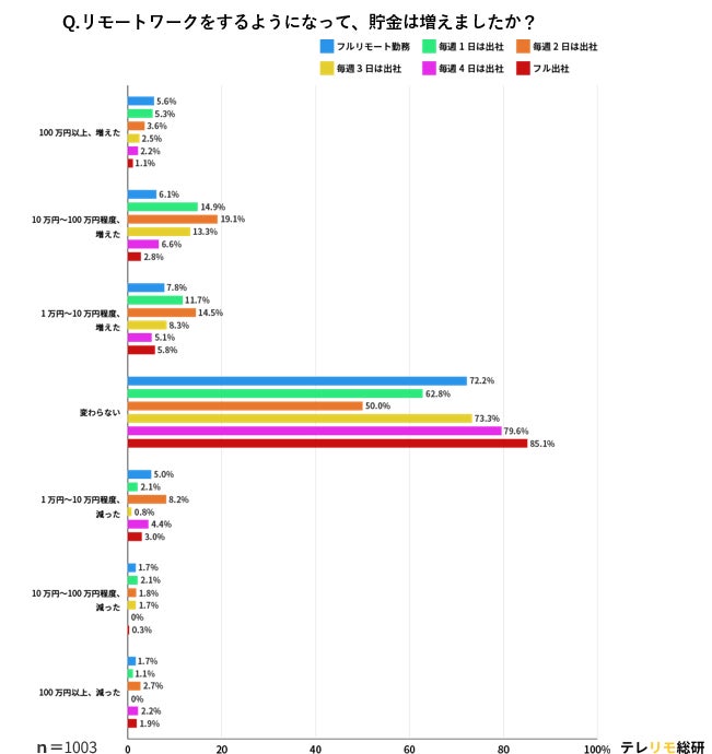 特に「100万円以上増えた」と回答した方は、フル出社から週4出社、週3、週2、フルリモートと、リモートワークで働く日が増えるごとに割合が右肩上がりに増えています。