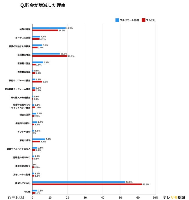 「100万円以上増えた」と回答した方の、フルリモートとフル出社の方で開きがどこから来ているのか、両者の理由について具体的に見ていきましょう。