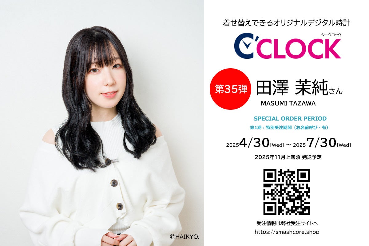 株式会社スマッシュコア エンターテインメント(本社:東京都中央区、代表取締役:福池 功)が展開する、データの着せ替えができるオリジナルデジタル時計【C'CLOCK(読み:シークロック)】。第35弾にて、『ウマ娘 プリティーダービー』イクノディクタス役などでご活躍の田澤 茉純(たざわ ますみ)さん(所属:俳協)モデルを2025年4月30日から受注開始いたします。