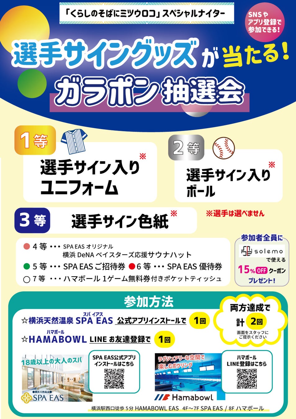 上記景品に加えて、オンライン通販サイト「solemo」で利用できる15%OFFクーポン券を抽選会参加者全員にプレゼントいたします。