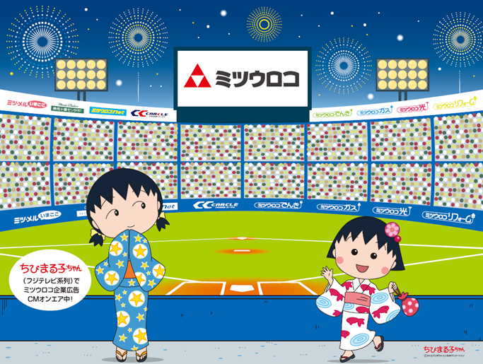 ちびまる子ちゃんと球場をイメージしたビジュアルを背景に、自由に撮影していただけます。