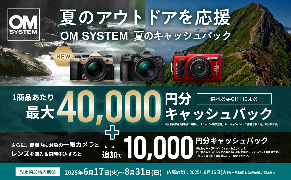 OMデジタルソリューションズ株式会社が展開する映像製品ブランド「OM SYSTEM」は、対象のミラーレス一眼カメラ、ミラーレス一眼カメラ用交換レンズ、およびコンパクトデジタルカメラをお買い上げいただいたお客さまを対象に、1商品あたり最大40,000円分の「選べるe-GIFT」をプレゼントする『夏のアウトドアを応援 OM SYSTEM 夏のキャッシュバック』キャンペーンを2025年6月17日(火)より実施します。