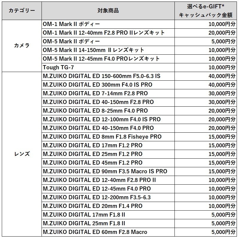 ・OM-1 Mark II または、OM-5 Mark II(各レンズキット含む)と対象レンズを対象期間内に購入し、同時に申し込みいただくことで追加10,000円分のキャッシュバックが適用されます。