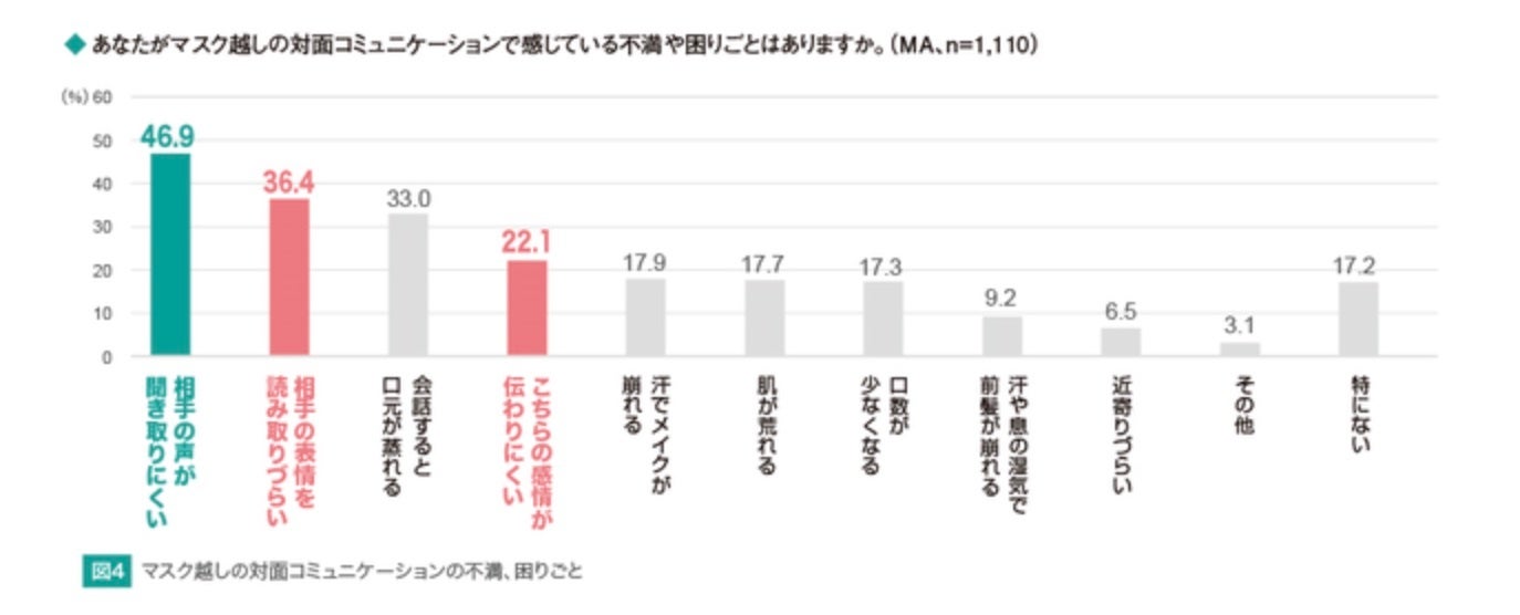 また、仕事を進める上でもリモートワークが主流となり、コミュニケーションの取り方は大きく変化しています。コロナ禍の代名詞となった「マスク着用」も企業での業務においても課題を残しました。株式会社マンダムの記事では、マスク着用によって起こる問題は「相手の声が聞きとりにくい」(46.9%)「相手の表情が読み取りづらい」(36.4%)や「こちらの感情が伝わりにくい」(22.1%)があげられています。
