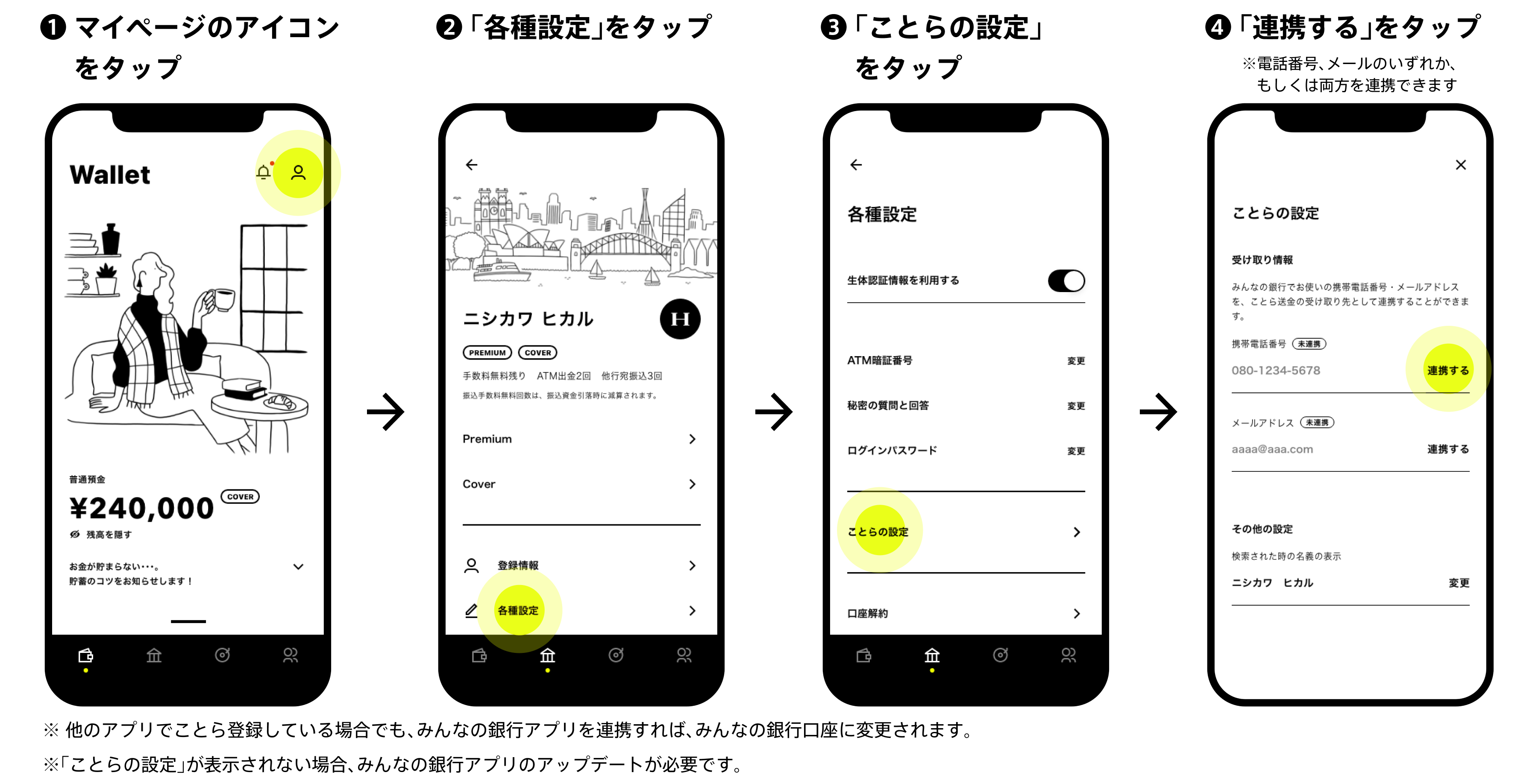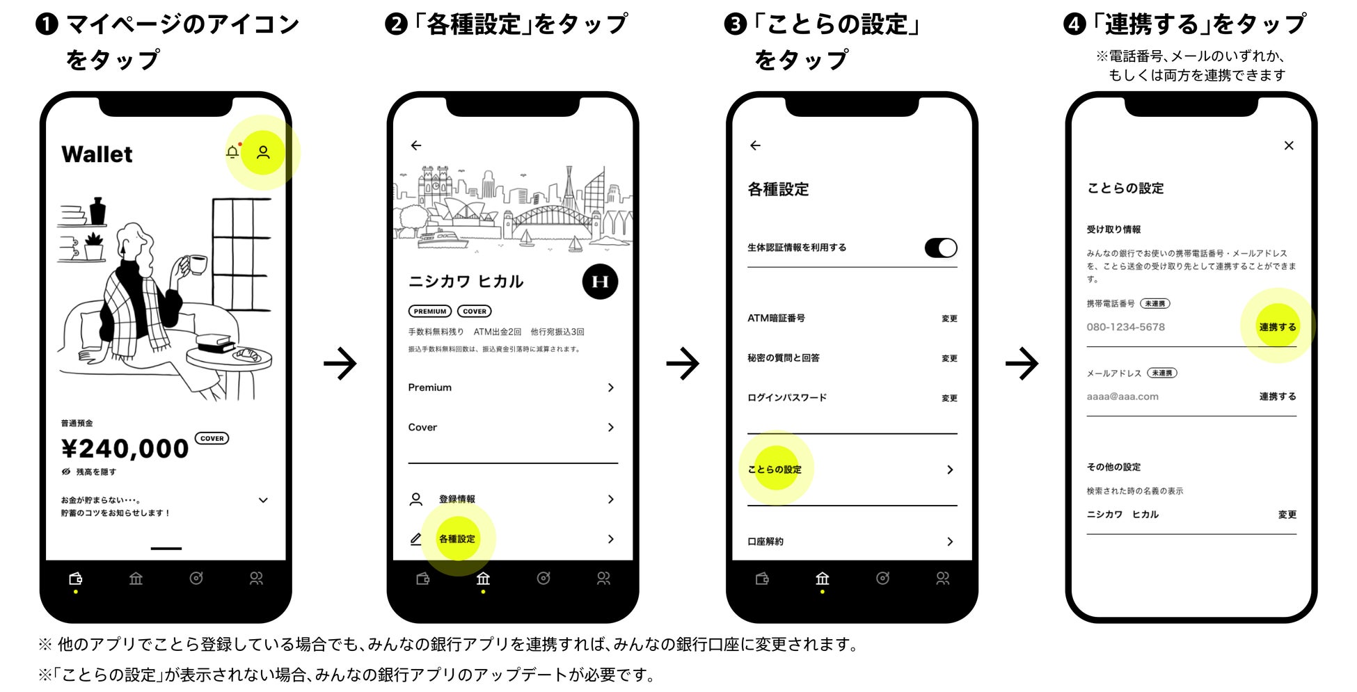 対象条件 | みんなの銀行アプリ内「ことらの設定」にて、携帯電話番号またはメールアドレスのいずれか1つ以上を受け取り情報として連携すること |