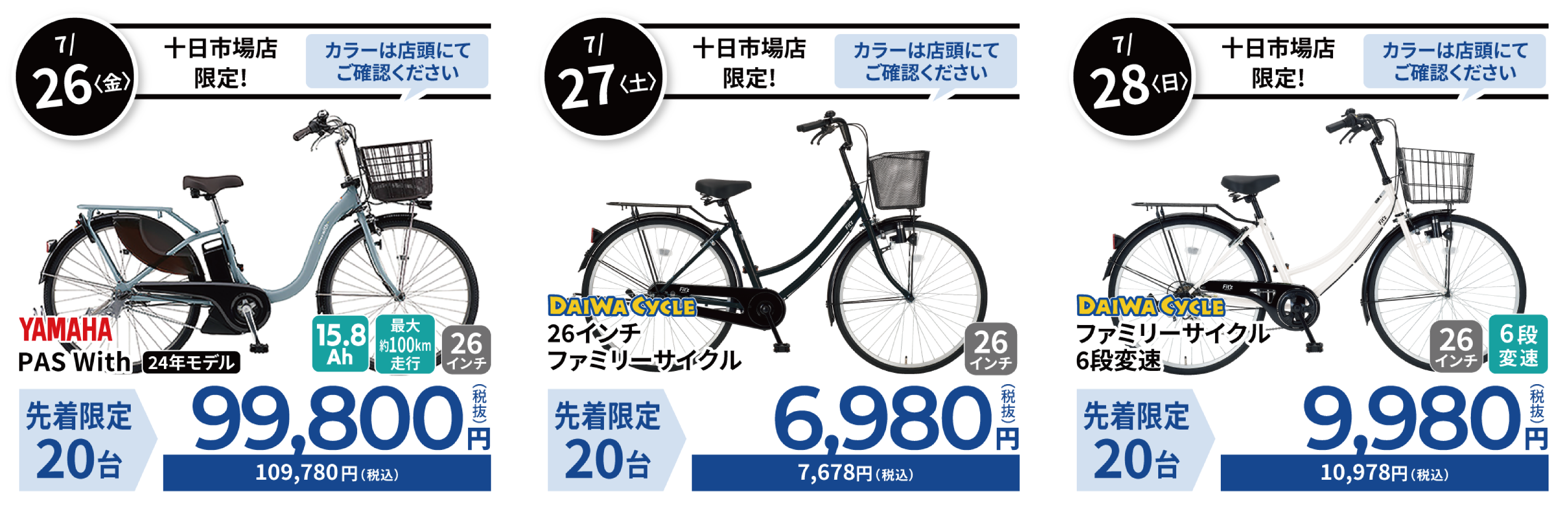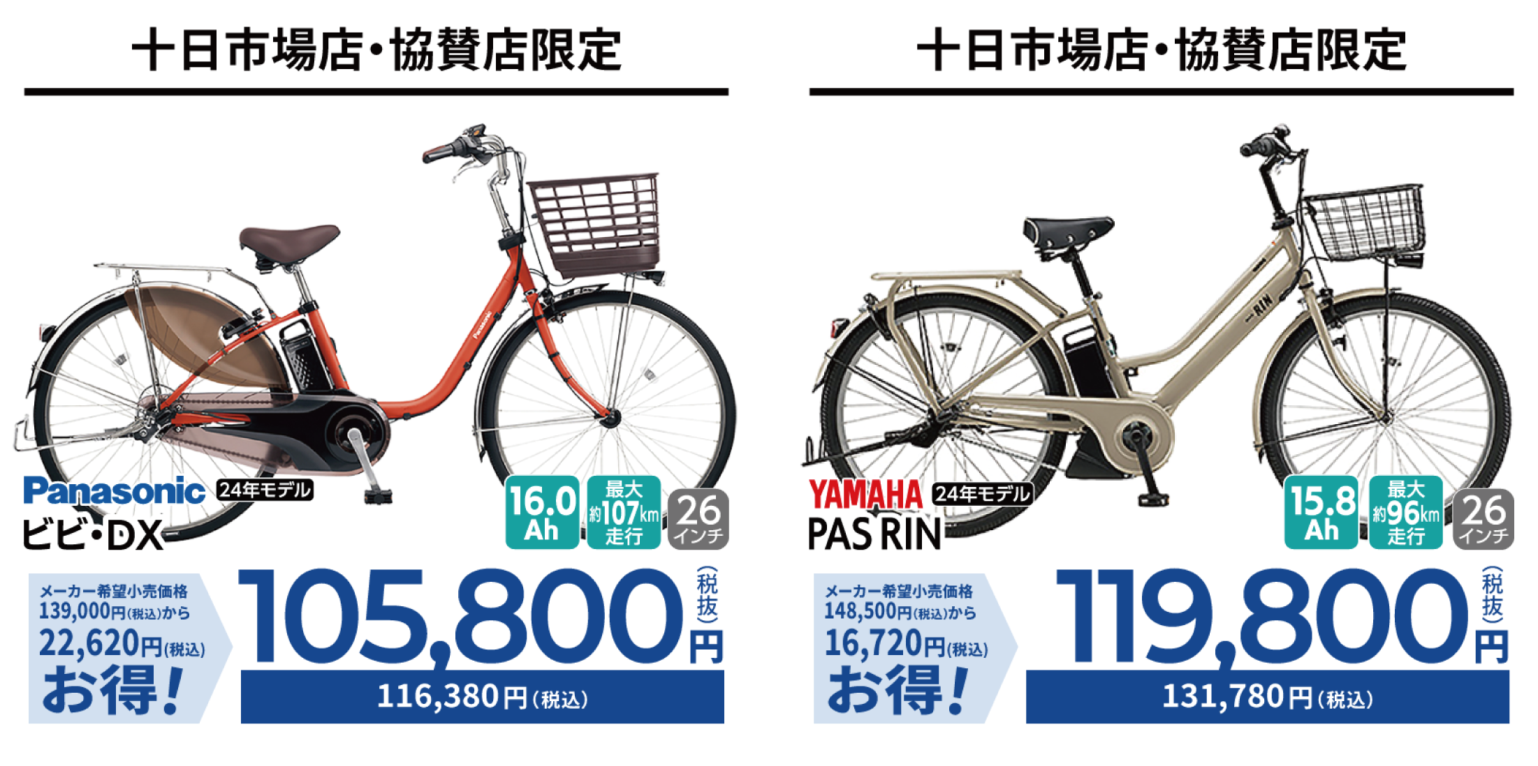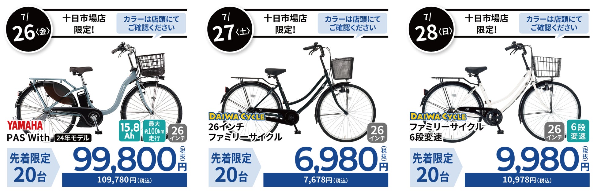 各種電動アシスト自転車に関してはWebサイト(https://www.daiwa-cycle.co.jp/feature/open_tokaichiba)よりクーポンをご持参いただくと10,000円(税込)引で販売をさせていただきます。(クーポン利用については条件がございますので、クーポン券の注記をご確認の上ご利用願います。)