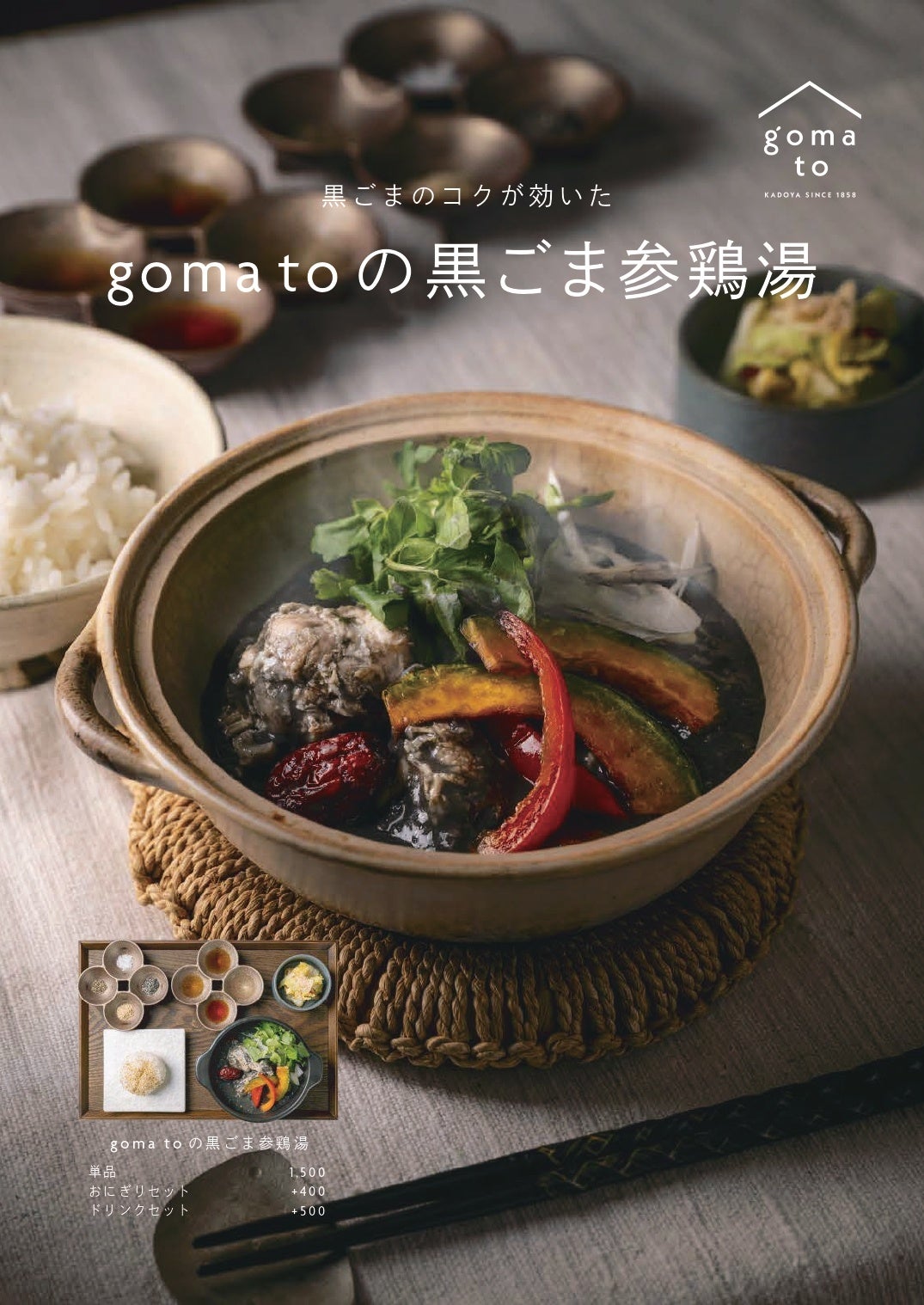 1858年に小豆島で創業し、165年以上にわたって“ごま”を通じてお客様に健康と笑顔をお届けするかどや製油株式会社(所在地:東京都品川区、代表取締役社長:北川 淳一)が運営する、ごま専門café & izakaya『goma to』(読み:ゴマト)は、12月20日(土)より冬季限定のディナーメニューとして、「goma toの黒ごま参鶏湯」を提供いたします。黒ねりごまの深いコクと香ばしさが溶け込んだスープに、ほろほろに煮込んだ手羽元、滋養食材を合わせた“心も体も温まる一杯です。寒い季節に嬉しい、滋味深くしっかりと満足感のある一品に仕上げました。