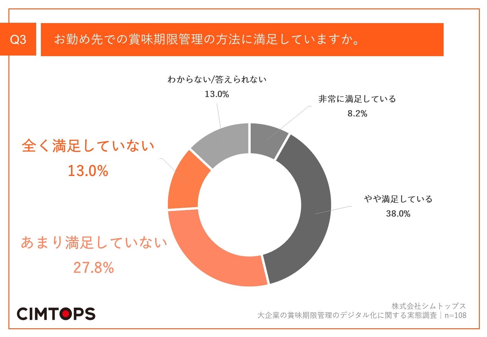 「Q3.お勤め先での賞味期限管理の方法に満足していますか。」(n=108)と質問したところ、「あまり満足していない」が27.8%、「全く満足していない」が13.0%という回答となりました。