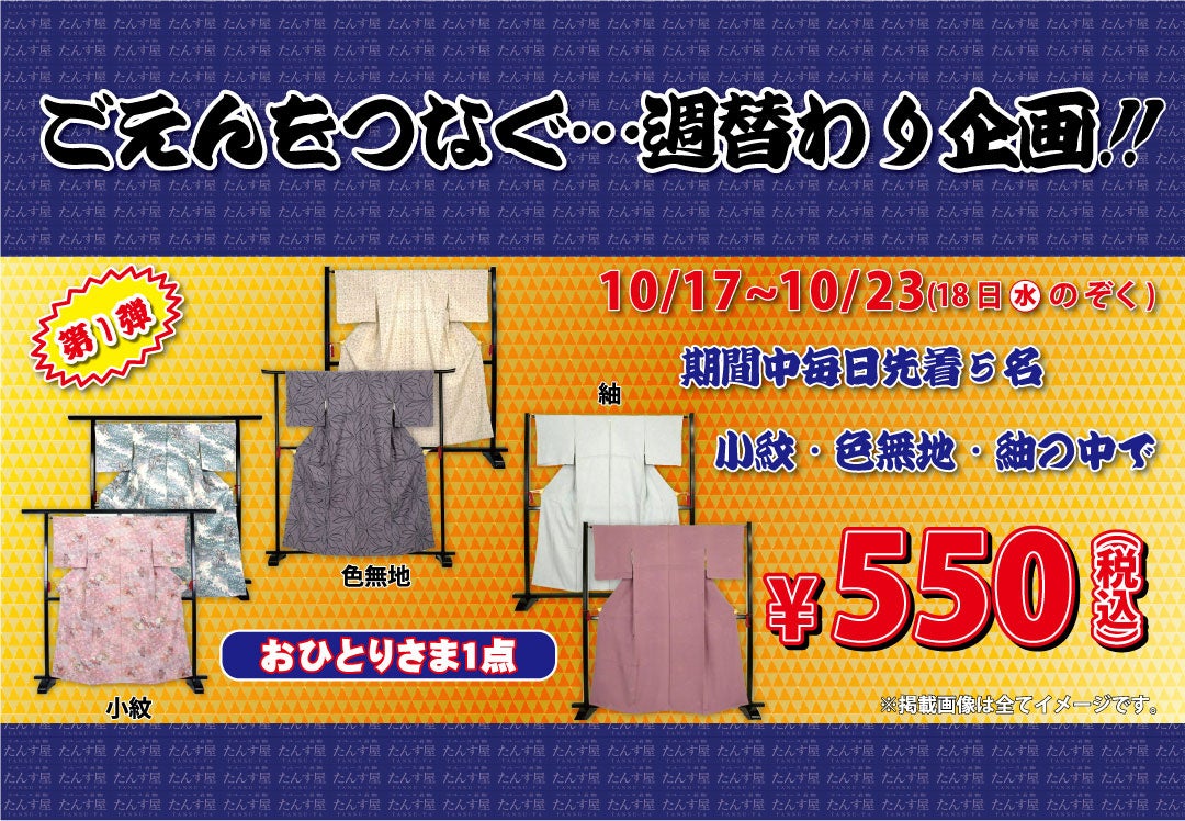 ・期間中毎日先着5名、小紋、色無地、紬の中で、おひとり様1点550円(税込)