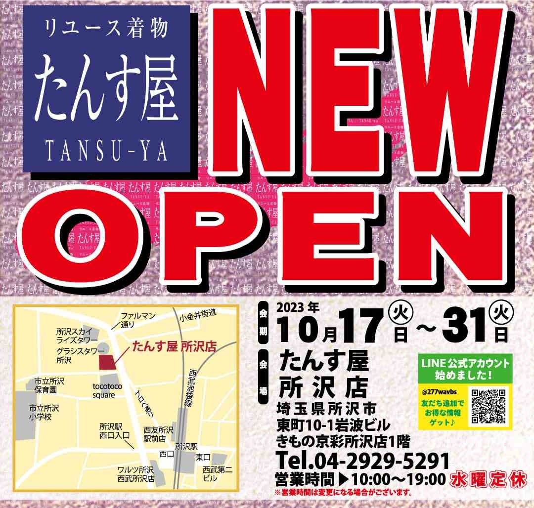 リユース着物「たんす屋 所沢店」が2023年10月17日から「きもの京彩 所沢店」の1階にオープン!