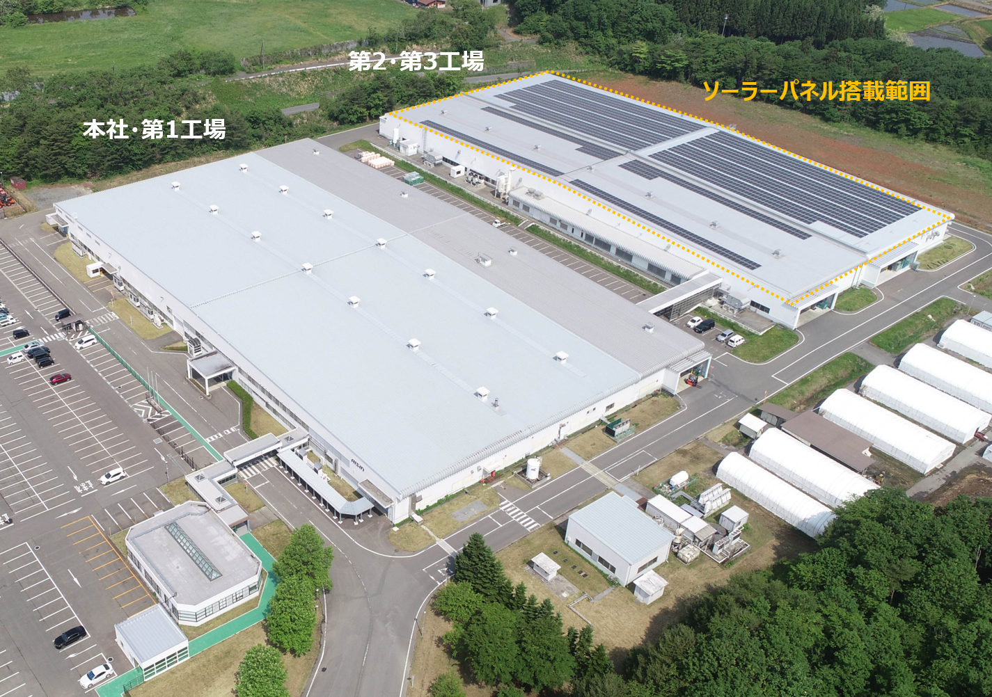 アイシン東北は、脱炭素社会の実現に向けた取り組みの一環として、アイシン東北の第2・第3工場の屋根に太陽光発電設備をコーポレートPPAにて設置し、発電した再生エネルギー由来の電力を工場にて使用します。