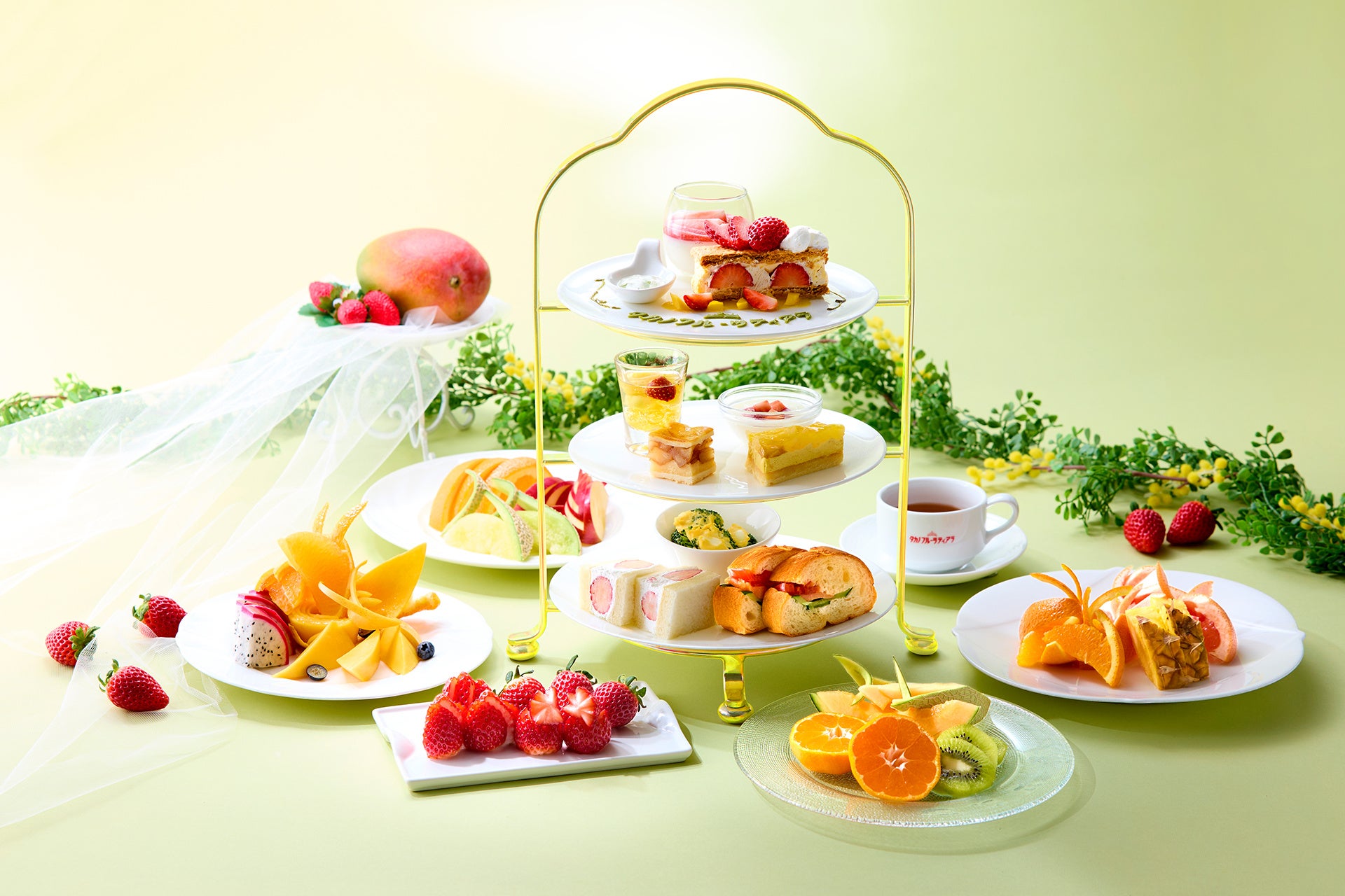 春をイメージしたアフタヌーンティーには、エディブルフラワーでドレスアップしたゼリーや、ミモザをモチーフにしたサラダを。スイーツのメインは、甘酸っぱい苺をマンゴークリームとパイでサンドしたミルフィーユをご用意しました。