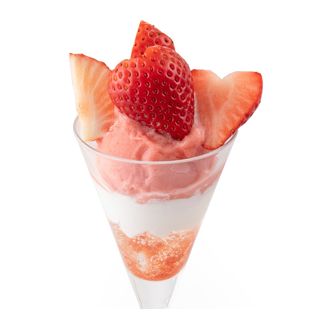 苺の香りと甘酸っぱさをしっかりと感じられる店内製造シャーベットとラズベリーソース、コアントローゼリー、ディプロマットクリームを重ねたパフェです。