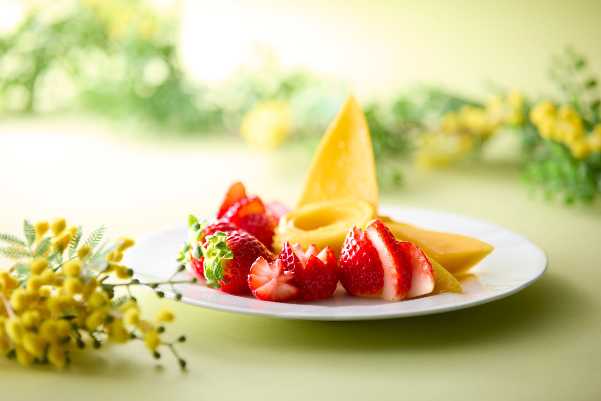 カットフルーツには苺の他、入荷次第でマンゴーのご提供も予定しています。