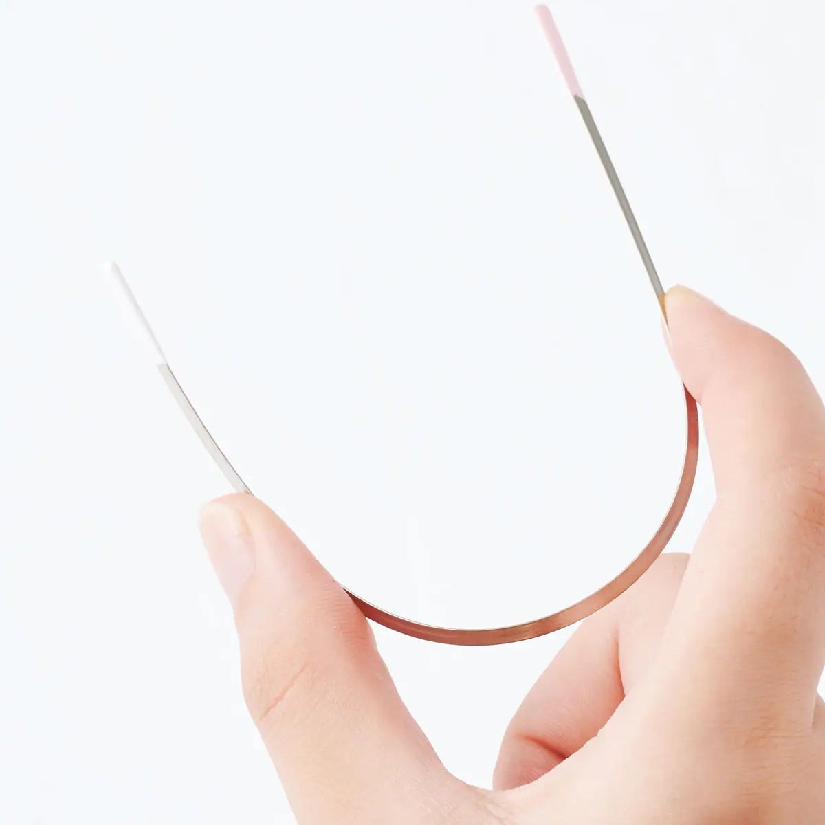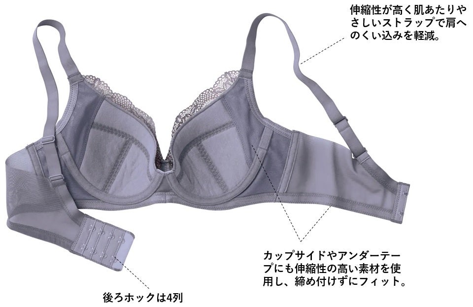ワイヤーブラをもっと楽な着け心地にしたくて、ワイヤーの素材と形状から見直し、とても軽くて超ソフトなステンレス素材を採用。全長を短くし、前中心と脇の圧迫感を軽減。薄手のヘム素材のサイドベルトや、高伸度のアンダーテープなど細部にもこだわり、伸びやかにフィットしながらきちんとバストを持ち上げます。日本製レースをあしらったデザインは、見た目にも軽やかで、上品な印象。洋服感覚でサイズ選びができるのもポイントです。
