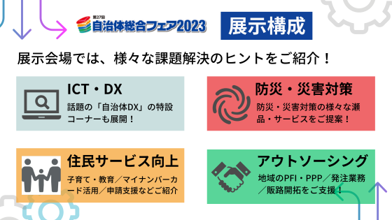 「ICT・DX」「防災・災害対策」「住民サービス向上」「アウトソーシング」の4つの展示エリアを展開。