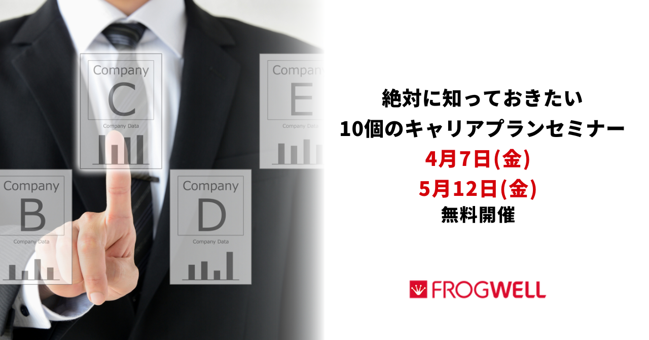 Salesforce自体は多くの企業で使われ、世の中の動きもあって、今もなお導入企業は拡大しています。しかし、自身のSalesforceの経験を生かしたキャリアを積んていくためには、自身がキャリアに関する知識、キャリアを見極める力が必要になっているのです。 そこで、少しでもそんな方へ支援ができればと思い、この度フロッグウェルではセミナーを企画いたしました。今回は、実際に採用担当として多くの方に話を聞いてきた経験やインプリパートナーとして様々な企業とのSalesforce導入支援、協業支援の経験を元にSalesforceの経験に限定した、キャリアプランをご紹介していきます。 ぜひ奮ってご参加ください。