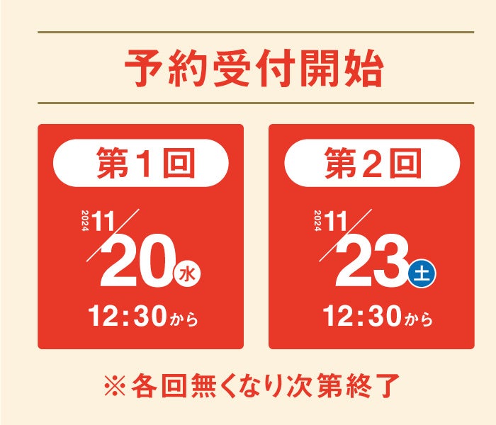 毎年、公式オンラインショップでは早々に完売となることから、今年もより多くのお客様にご購入の機会を設けるために、予約受付開始日を2回に分けています。