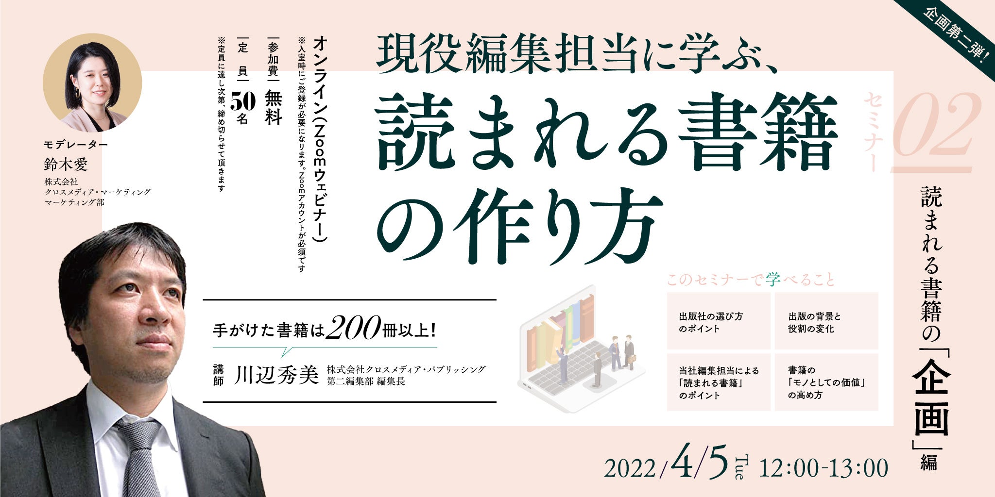 クロスメディアグループ(所在地:東京都渋谷区千駄ヶ谷 代表取締役:小早川幸一郎)のグループ会社である、株式会社クロスメディア・マーケティングは、2022年4月5日(火)株式会社クロスメディア・パブリッシング 第二編集部 編集長 川辺 秀美氏による「読まれる書籍の作り方セミナー② 読まれる書籍の「企画」編」を開催致します。