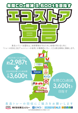 東北シジシー加盟社の店舗では、使用済みトレーやペットボトルの回収を実施しており、回収資源から再生されたエコ製品「エコトレー」「エコAPET」を売り場で使用することによって、2023年度において約2,987tのCO2排出抑制に貢献されています。